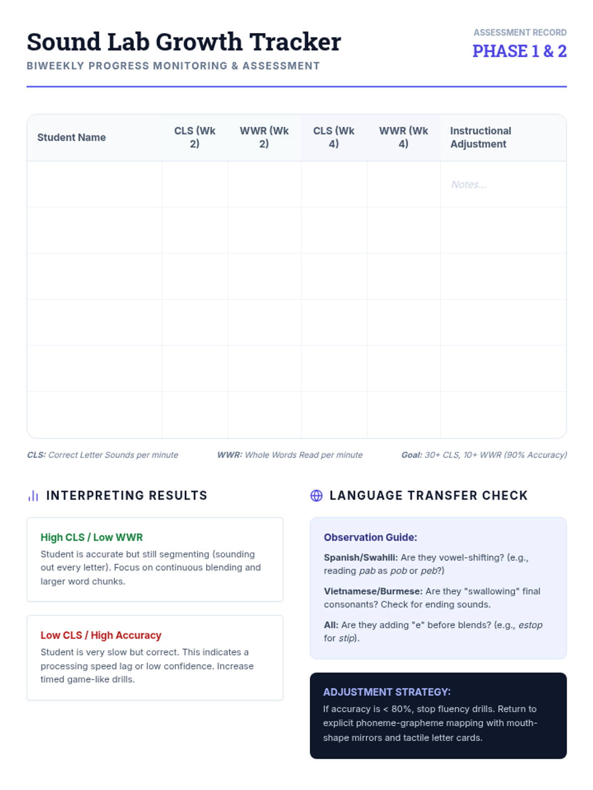A biweekly progress monitoring and data tracking sheet for nonsense word fluency, including interpretation guides for instructional adjustments.