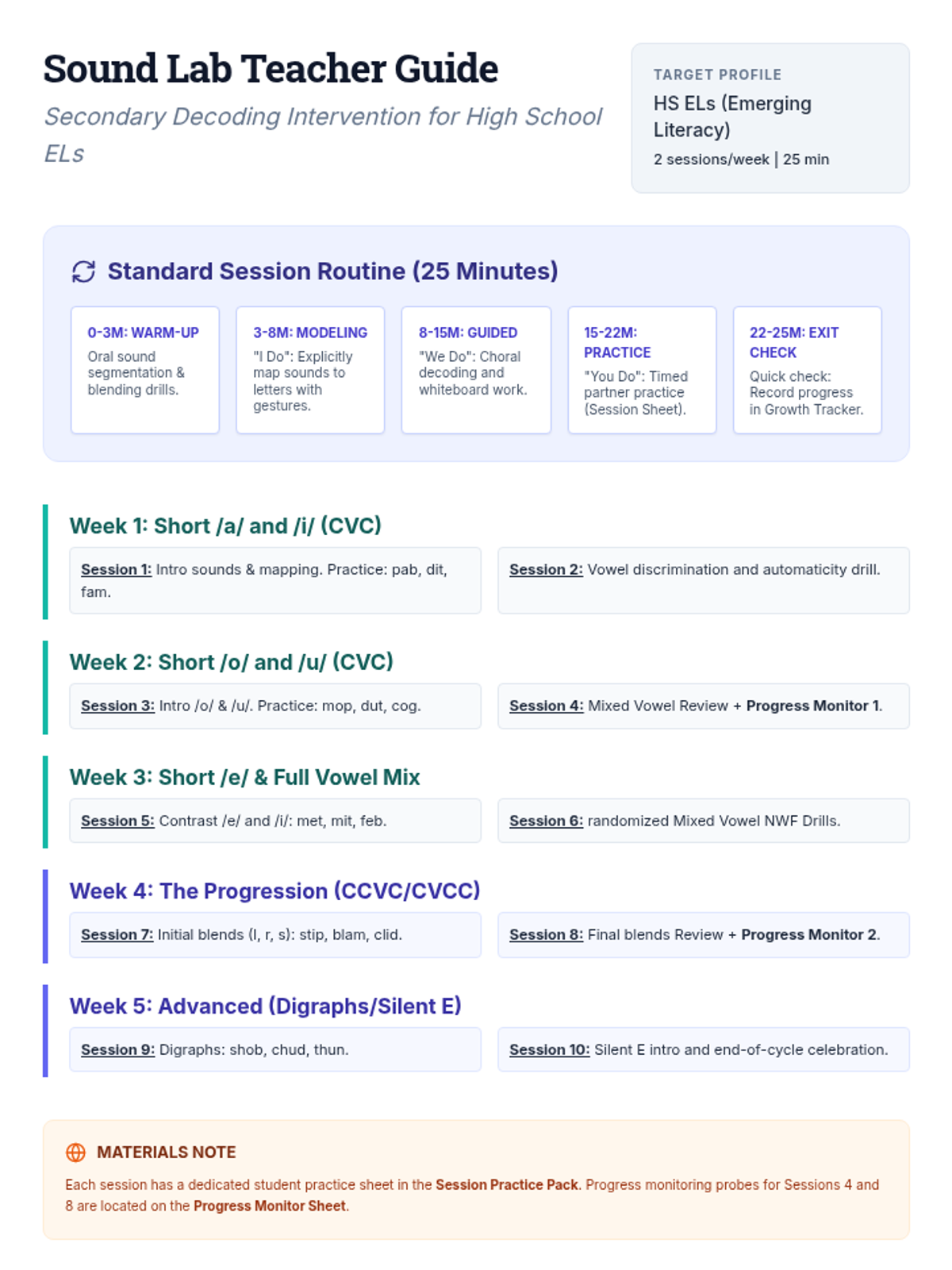 A concise 5-week teacher-facing intervention guide for high school ELs, detailing session routines and weekly objectives.
