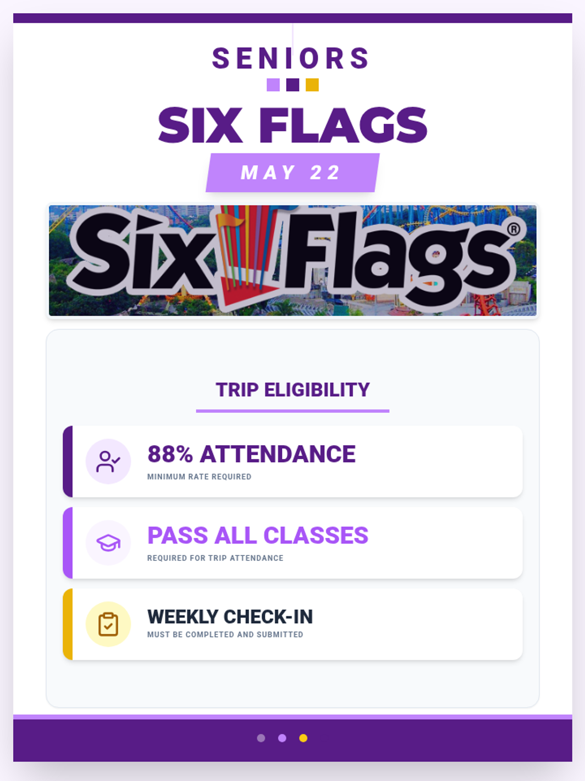 Updated the Six Flags Seniors Flyer with a purple color scheme and improved text contrast for better legibility on all devices and prints. This version also includes polished typography tracking.