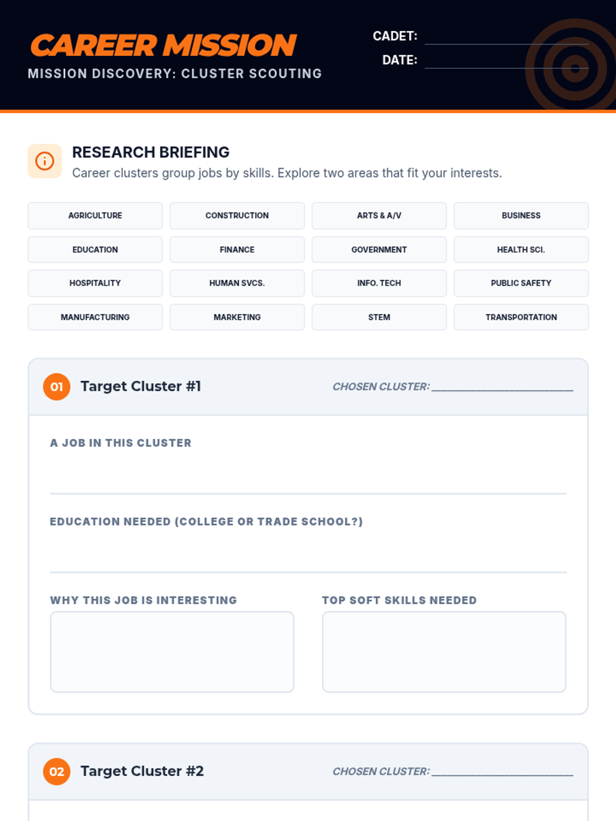 A research worksheet where students select and investigate two career clusters, identifying specific jobs, required education paths, and necessary soft skills. Revised to prevent section splits and provide more writing space.