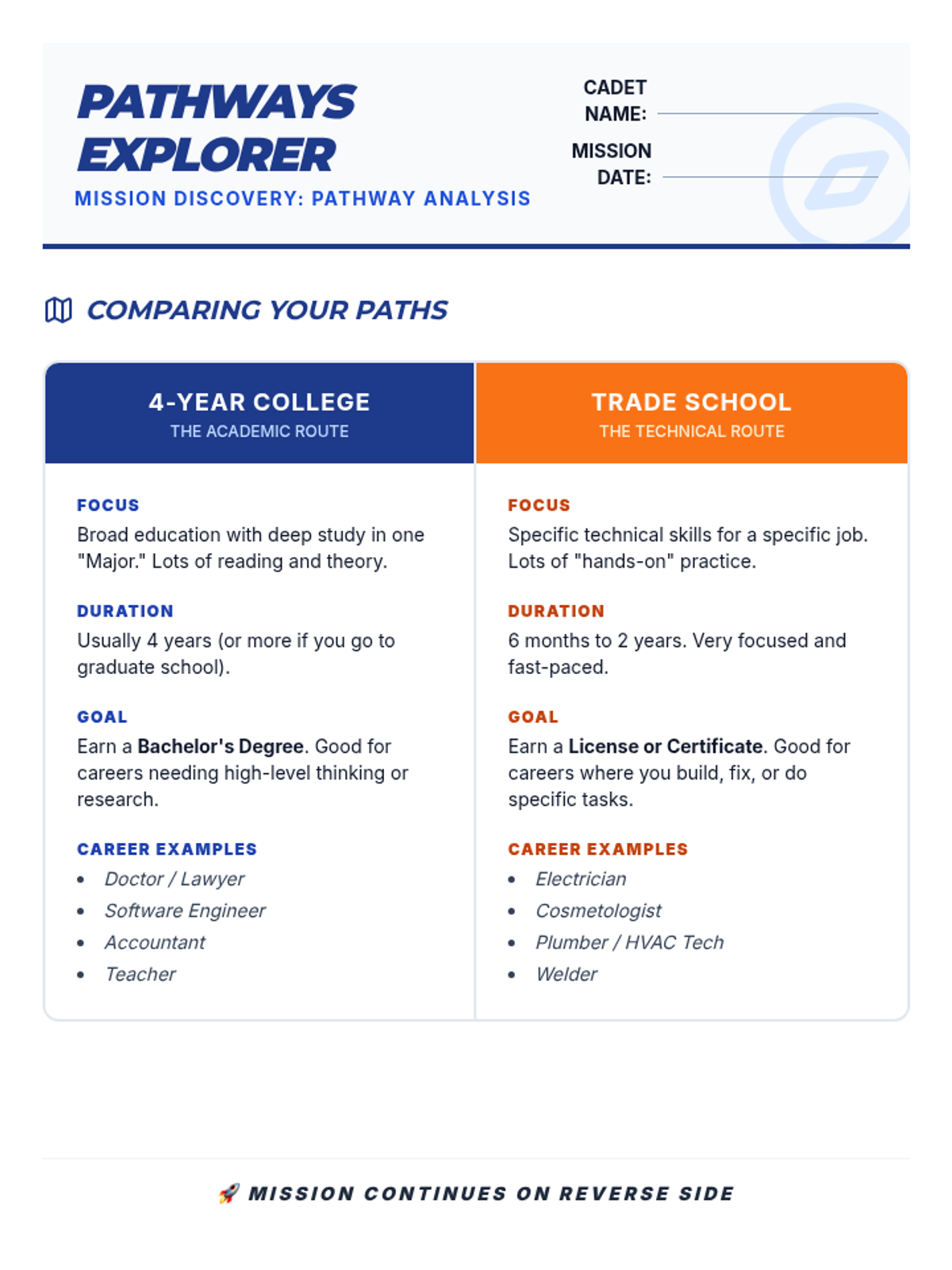 A comparative handout for students examining the differences between 4-year college and trade school, including a section on essential workplace soft skills and a reflection area. Revised for better page flow and contrast.