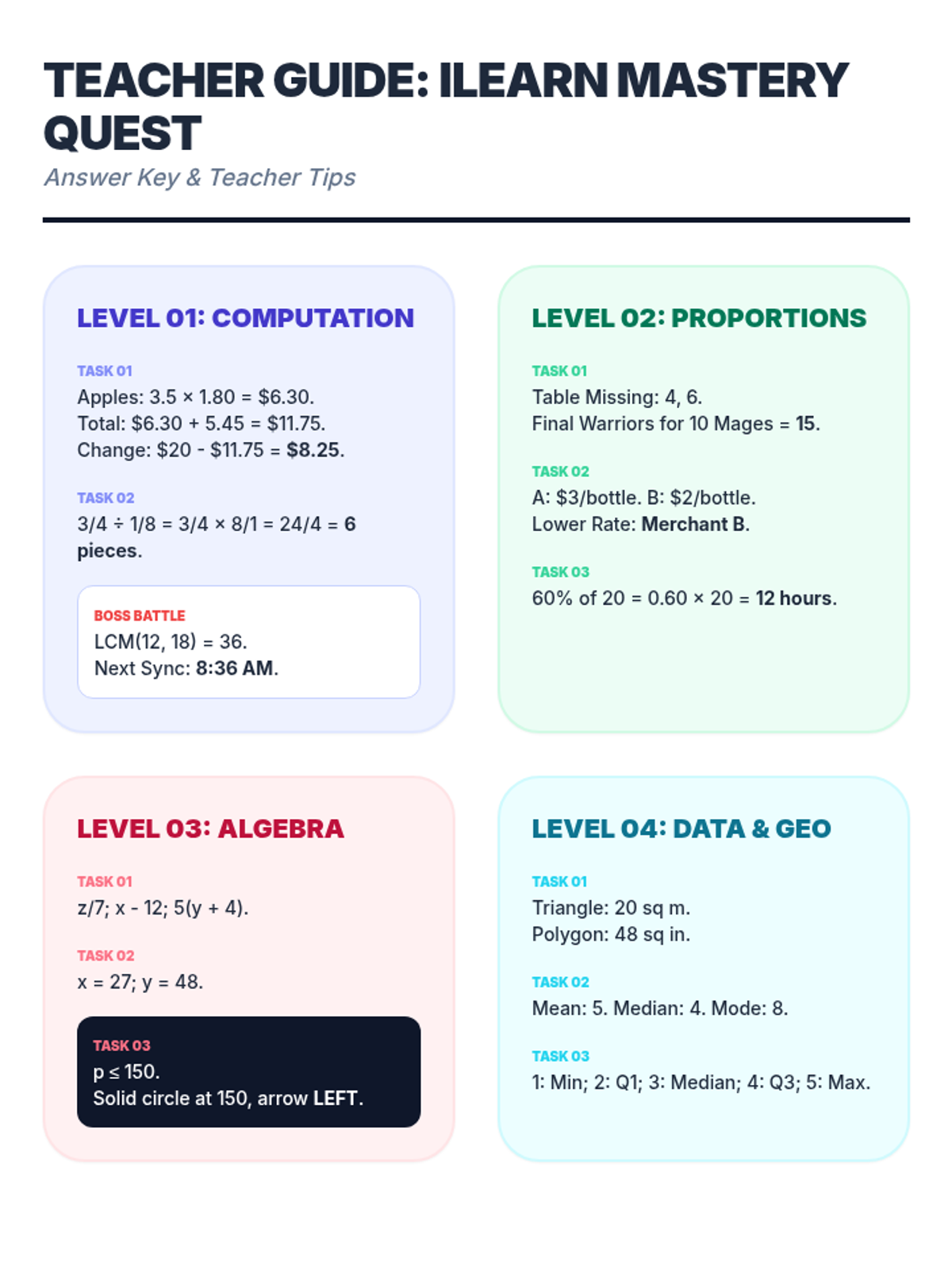 A comprehensive teacher guide and answer key for all four lessons of the ILEARN Mastery Quest. Revised to fix page breaks and improve LaTeX unit formatting.