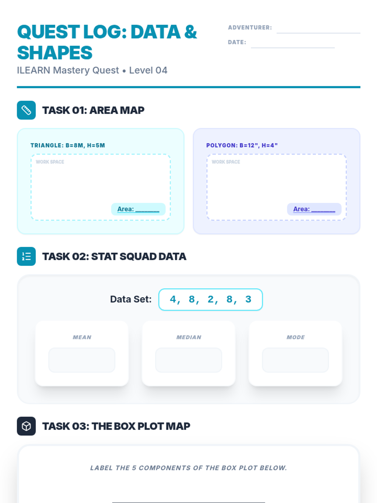 Final lesson digital slides for the ILEARN Mastery Quest. Revised to fix missing Volume content, replace placeholders with visual aids, and improve box plot label legibility.
