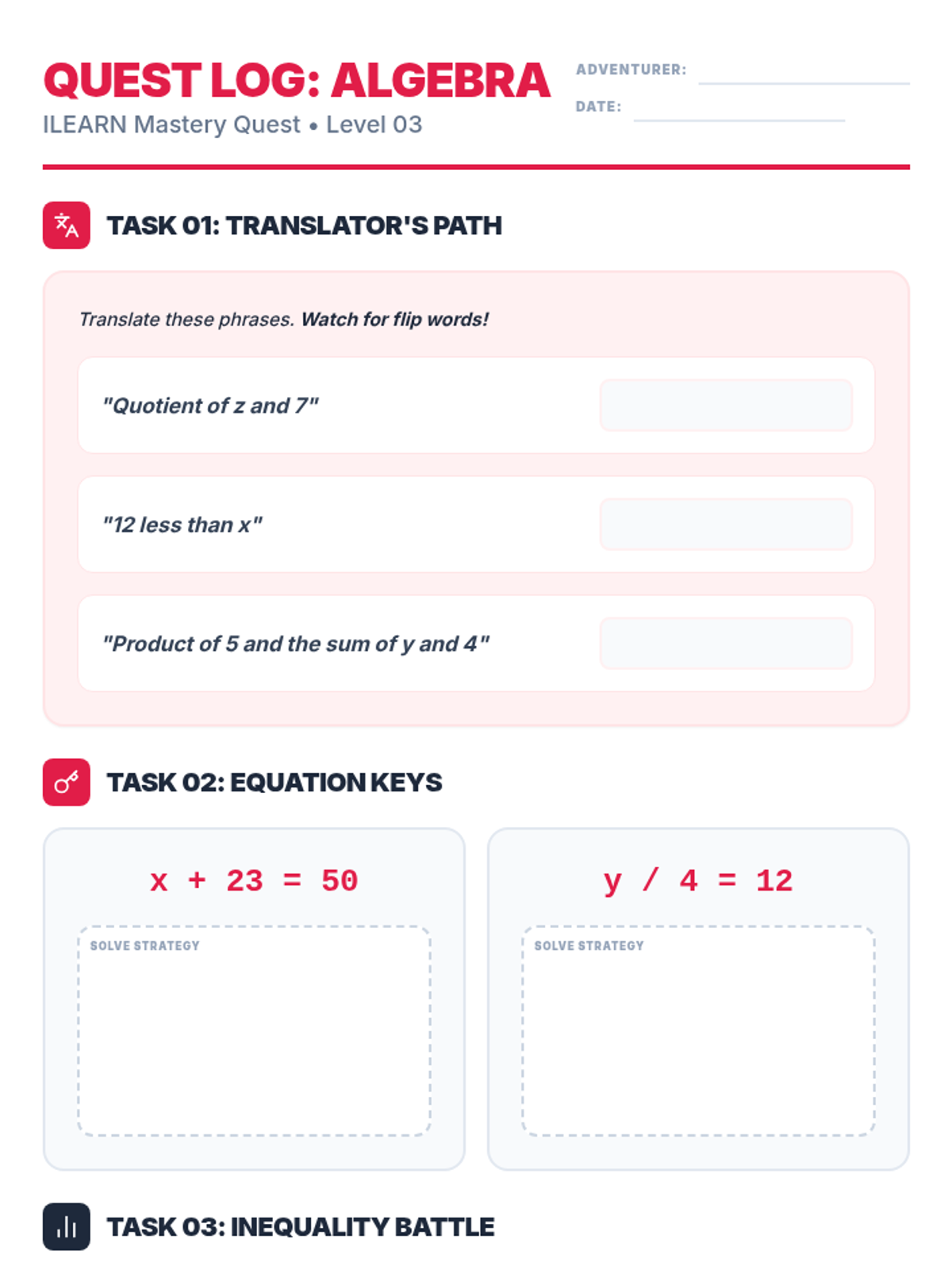 Student work log for the Algebra Arena lesson. Features high-contrast translation tasks, structured equation solving areas, and a real-world inequality challenge. Revised for efficiency.