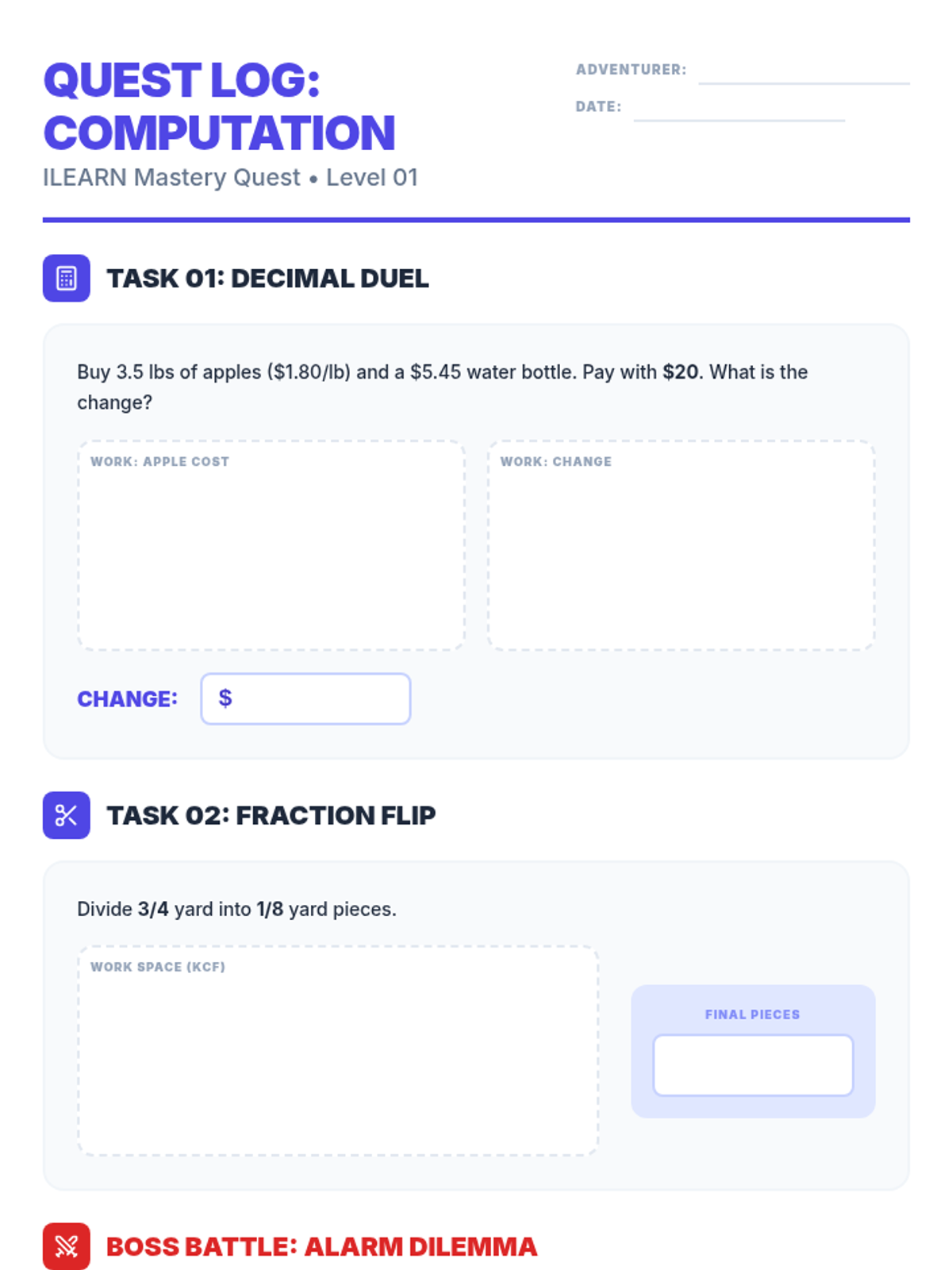 A printable student work sheet (Quest Log) that accompanies the Computation Quest slides. Revised to fix page breaks, improve fraction legibility, and provide larger work areas.