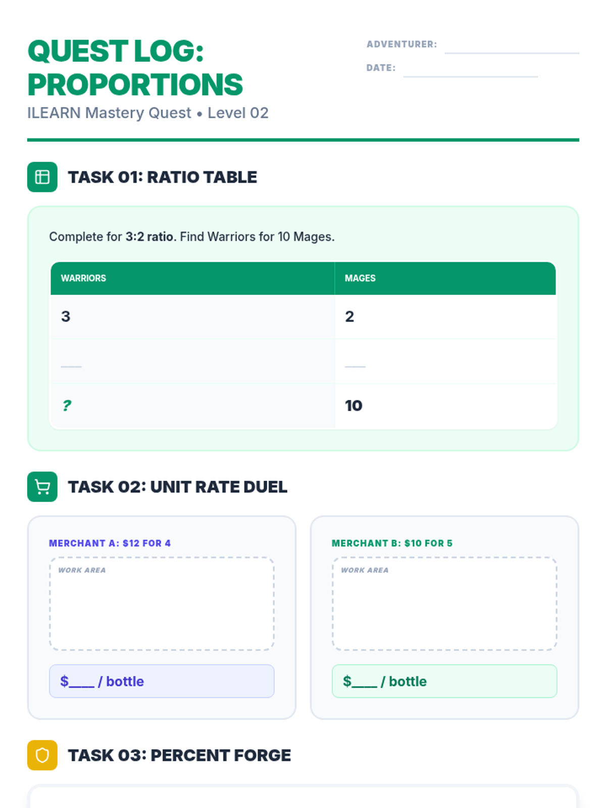 Student worksheet for the Proportion Path lesson. Revised to fix contrast in Task 03, provide more work space for division, and ensure light backgrounds for legibility.