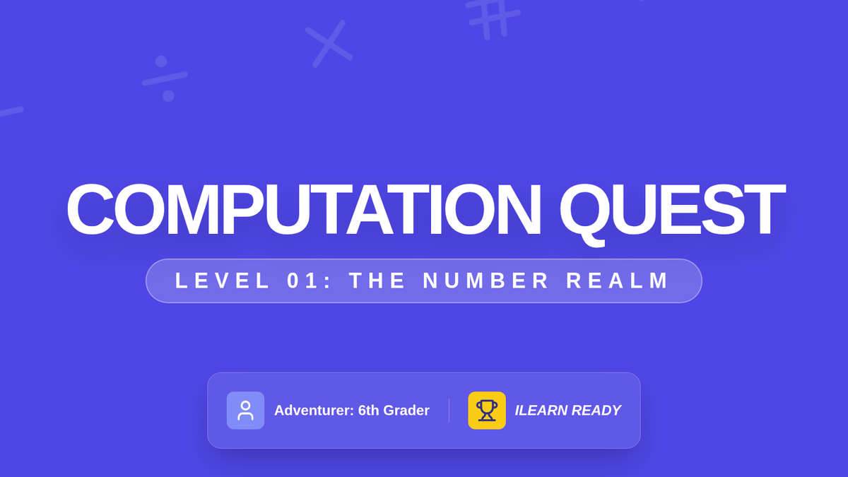 A dynamic digital slide deck for the first lesson of the ILEARN Mastery Quest, covering decimal operations, fraction division, GCF/LCM, and absolute value with a high-energy 'Quest' theme. Revised with improved rendering and legibility.