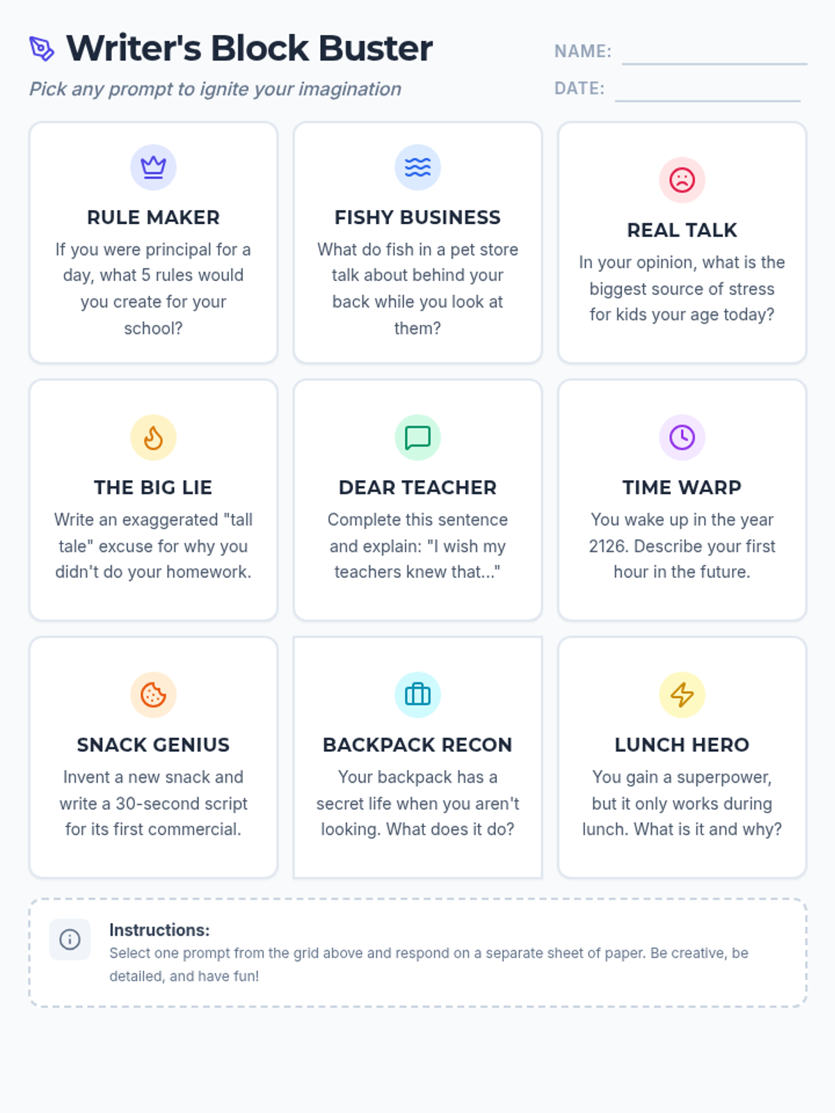 A creative 3x3 choice board for 6th-grade writing prompts. Each cell features a unique icon and engaging title to inspire student narrative, expository, and persuasive writing. This version is optimized for single-page printing.