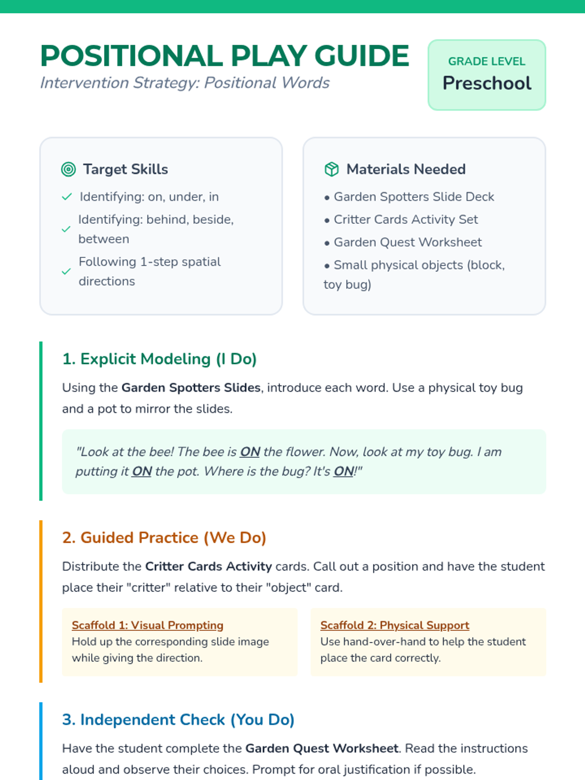 A comprehensive teacher's guide for a preschool positional words intervention, featuring explicit modeling steps, guided practice strategies, and a data collection tool.