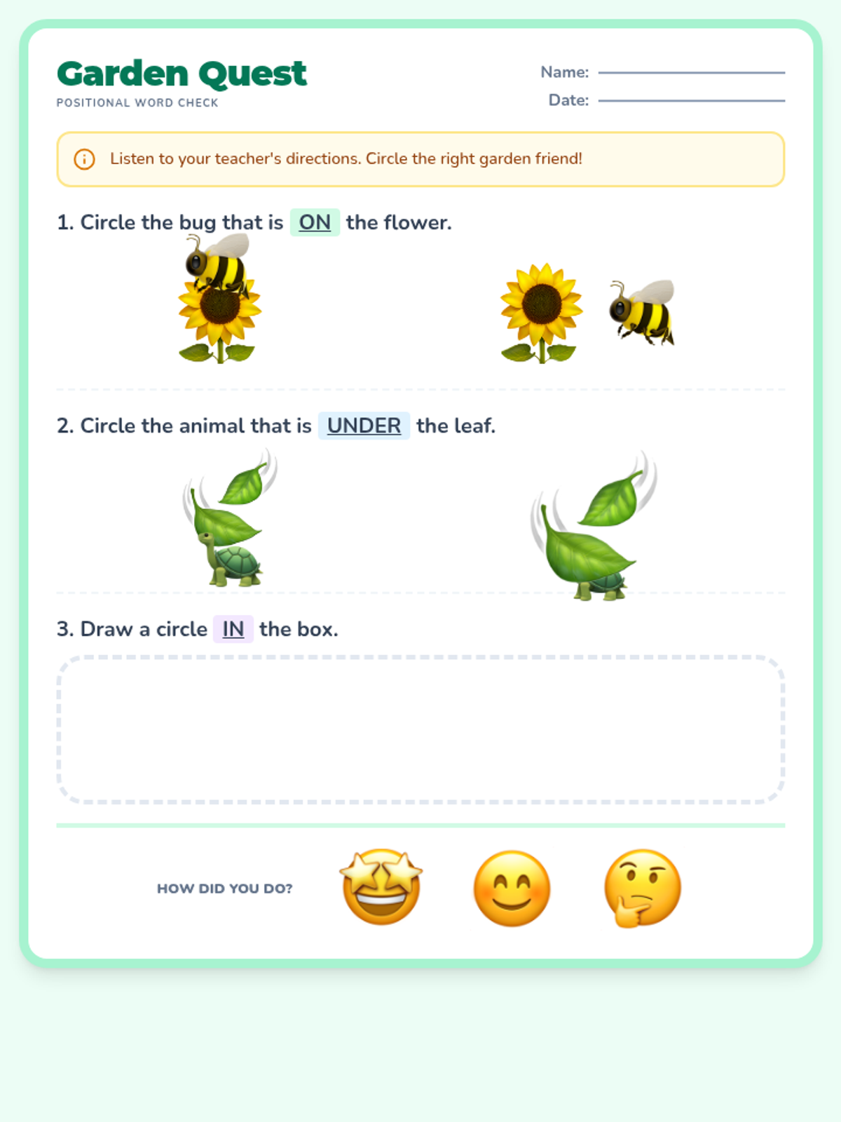 A preschool-friendly worksheet for assessing positional word comprehension, featuring clear visual options for 'on', 'under', and 'in'.