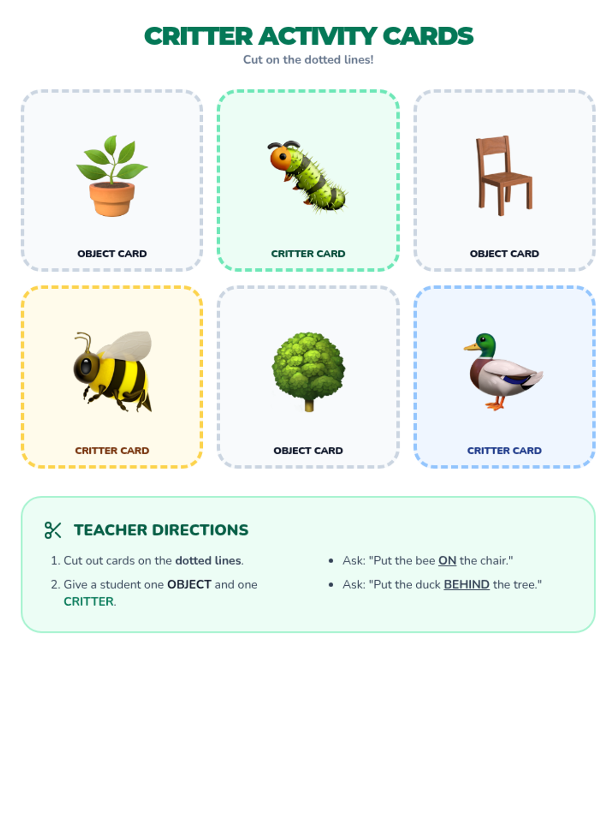 Cut-out activity cards for hands-on positional word practice, including various garden objects and critters to promote active learning and physical manipulation.