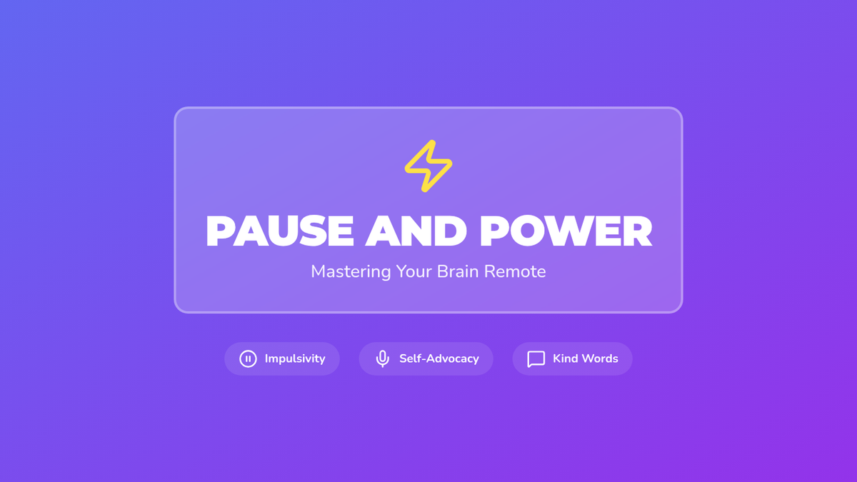 A vibrant, interactive slide deck designed for touchscreen displays. It uses the 'Brain Remote' metaphor to teach impulsivity control, conflict resolution, and self-advocacy through engaging visuals and prompts.