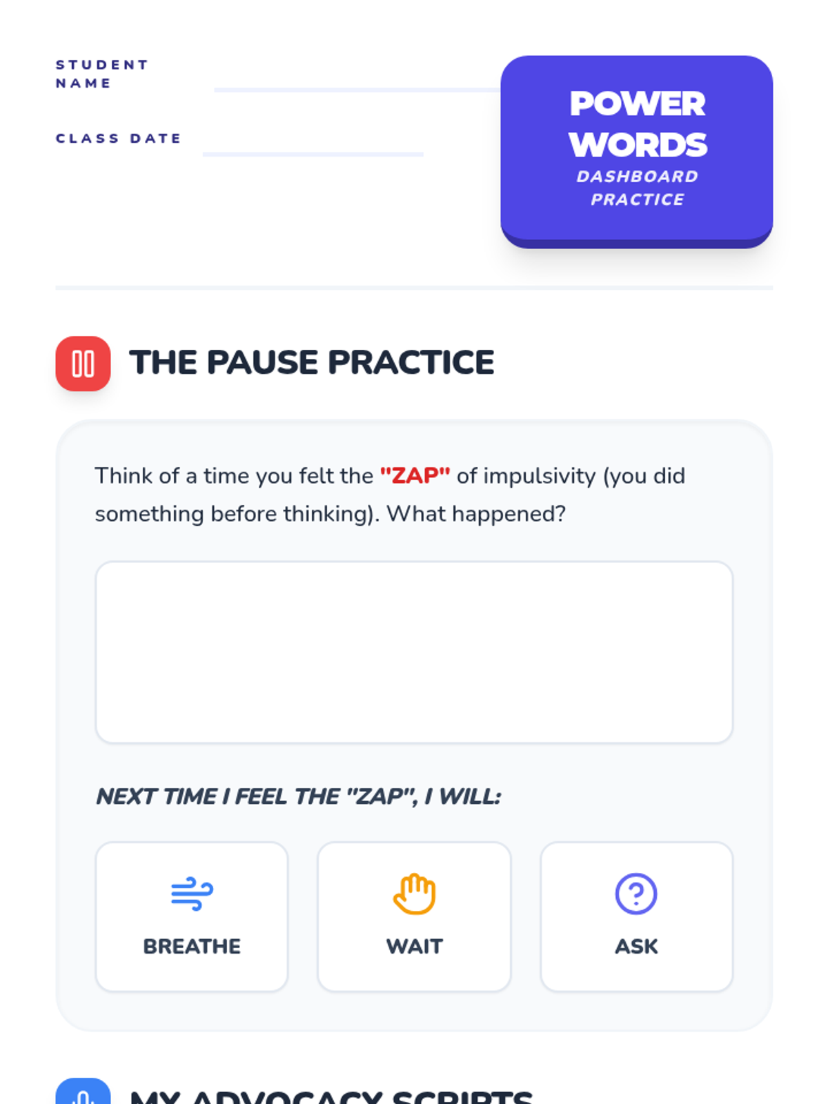 A student-facing worksheet for practicing self-advocacy scripts and reflecting on impulsive behaviors. It includes guided scenarios and creative spaces for students to develop their own 'Power Words'.