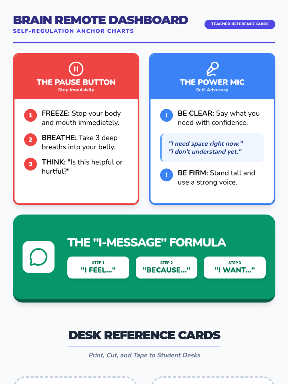 A set of visual anchor charts and desk reference cards featuring the 'Brain Remote' concept. It provides clear, actionable steps for students to manage impulsivity and use self-advocacy language.