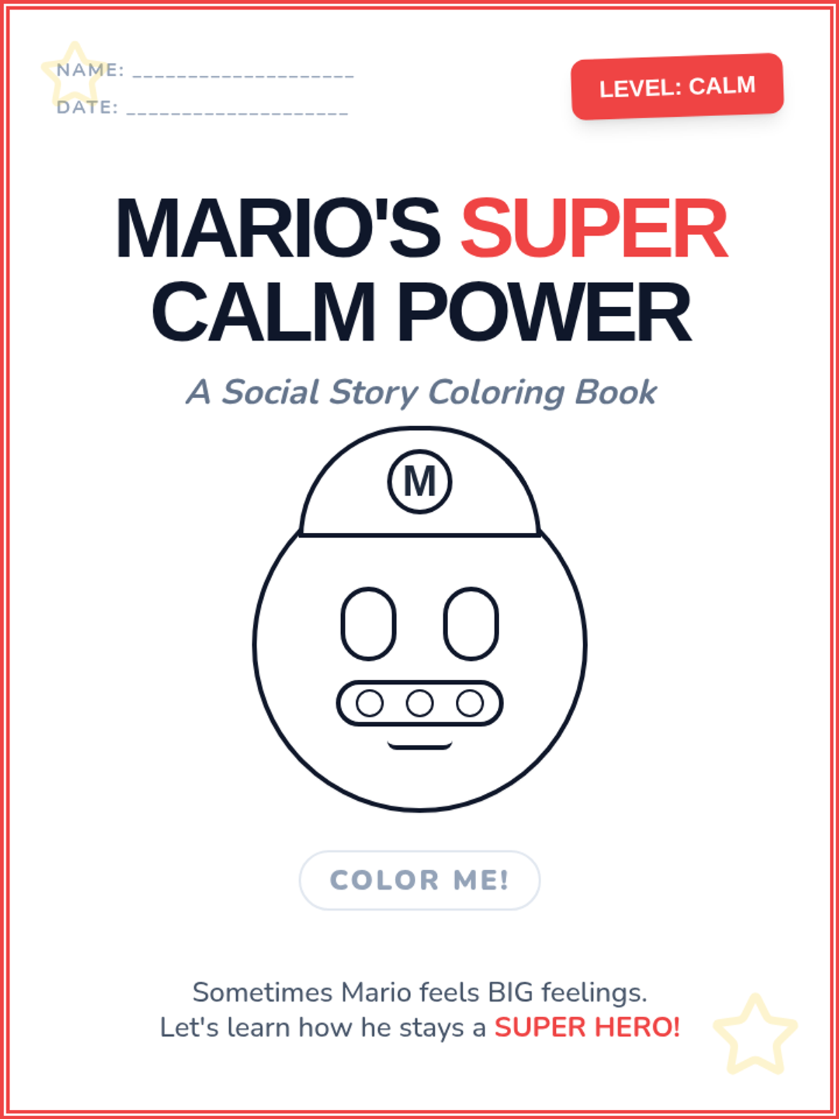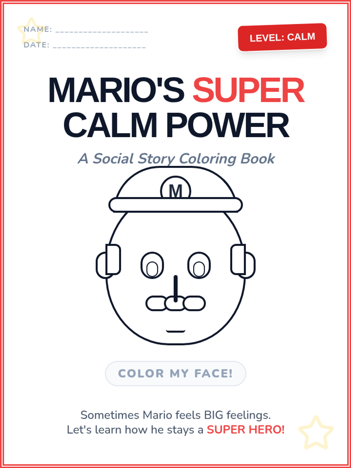 An updated 5-page coloring booklet social story featuring a much more detailed and recognizable Mario face created using advanced CSS shapes. It guides students through identifying anger triggers, recognizing body signals, and practicing deep breathing.