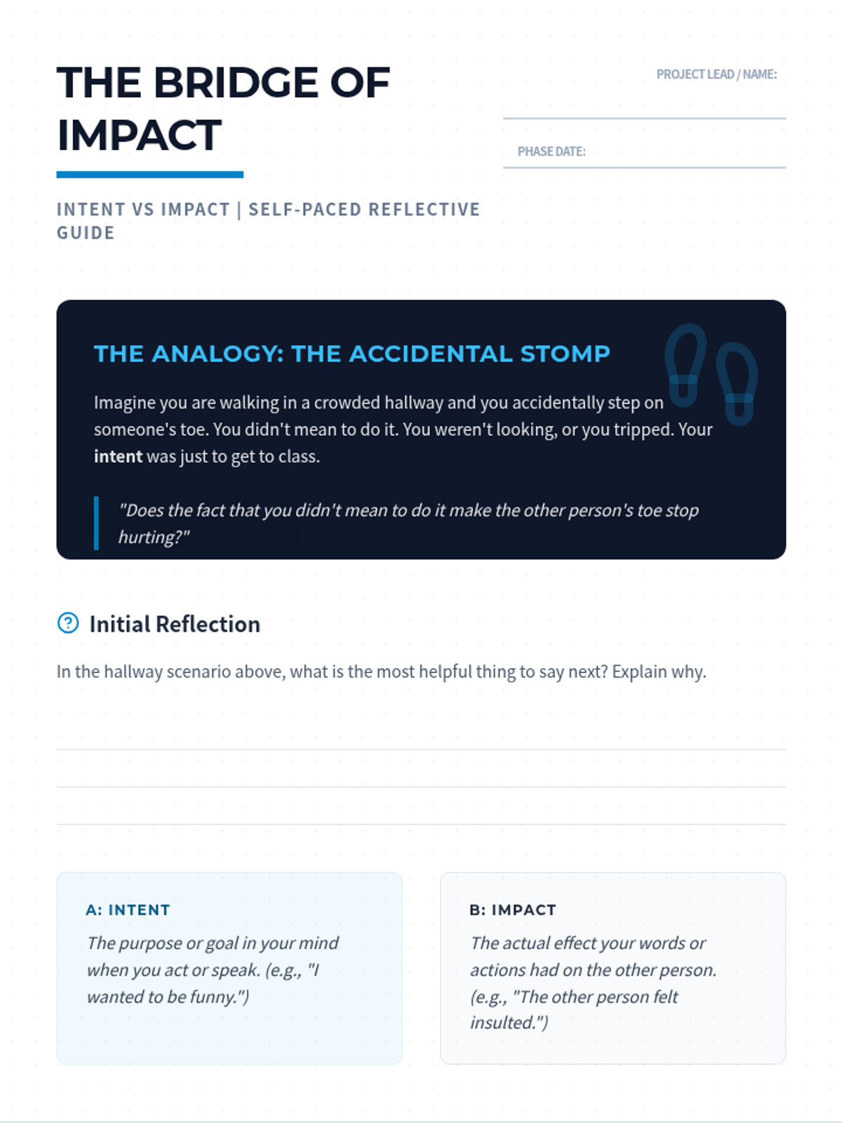 A 4-page student work packet designed to help students understand the difference between intent and impact. It includes analogies, scenario analysis, and a structured protocol for making apologies focused on impact rather than defense.