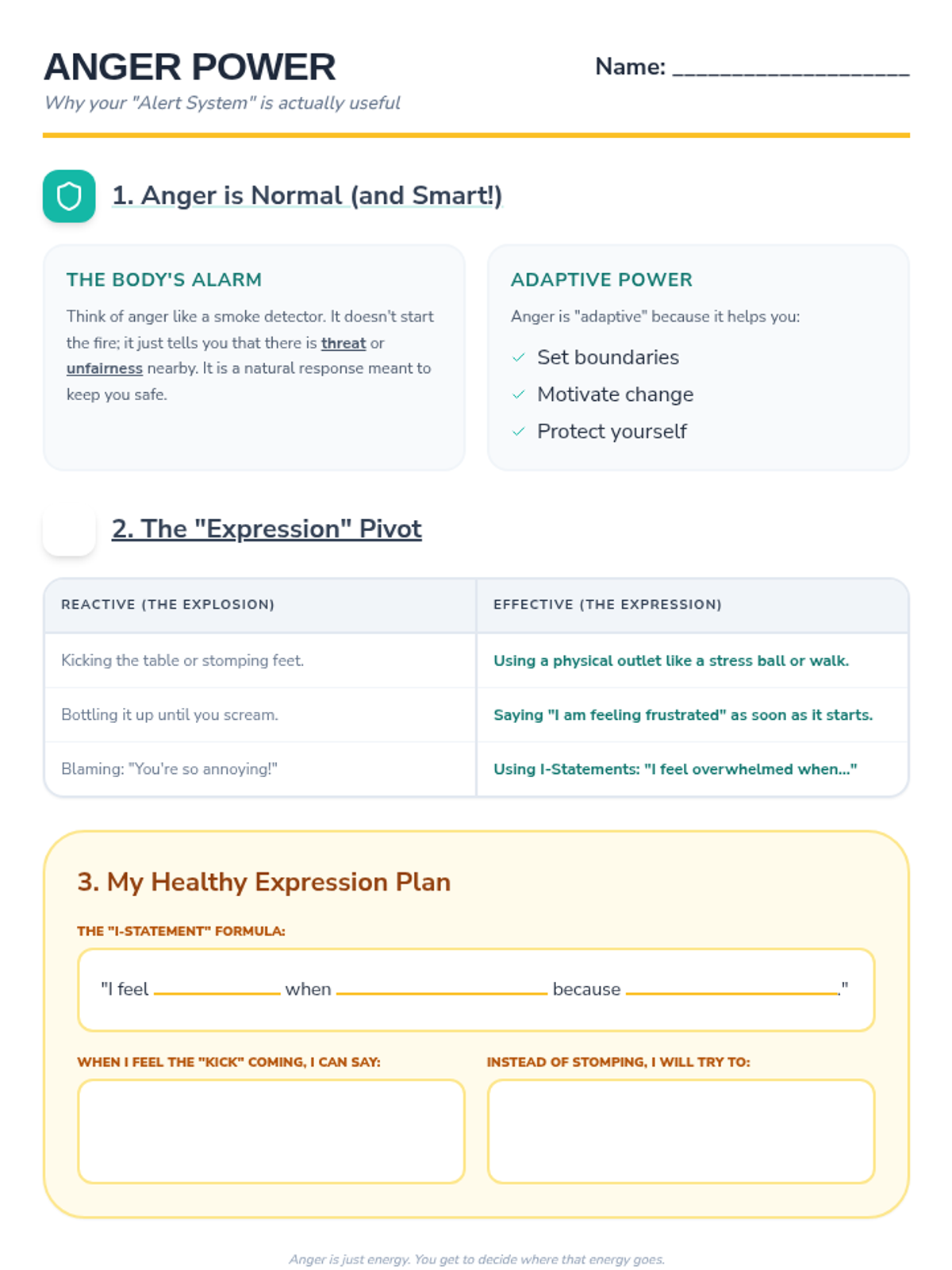 A psychoeducation worksheet explaining how anger is a normal, adaptive emotion and providing prompts for healthy verbal and physical expression.