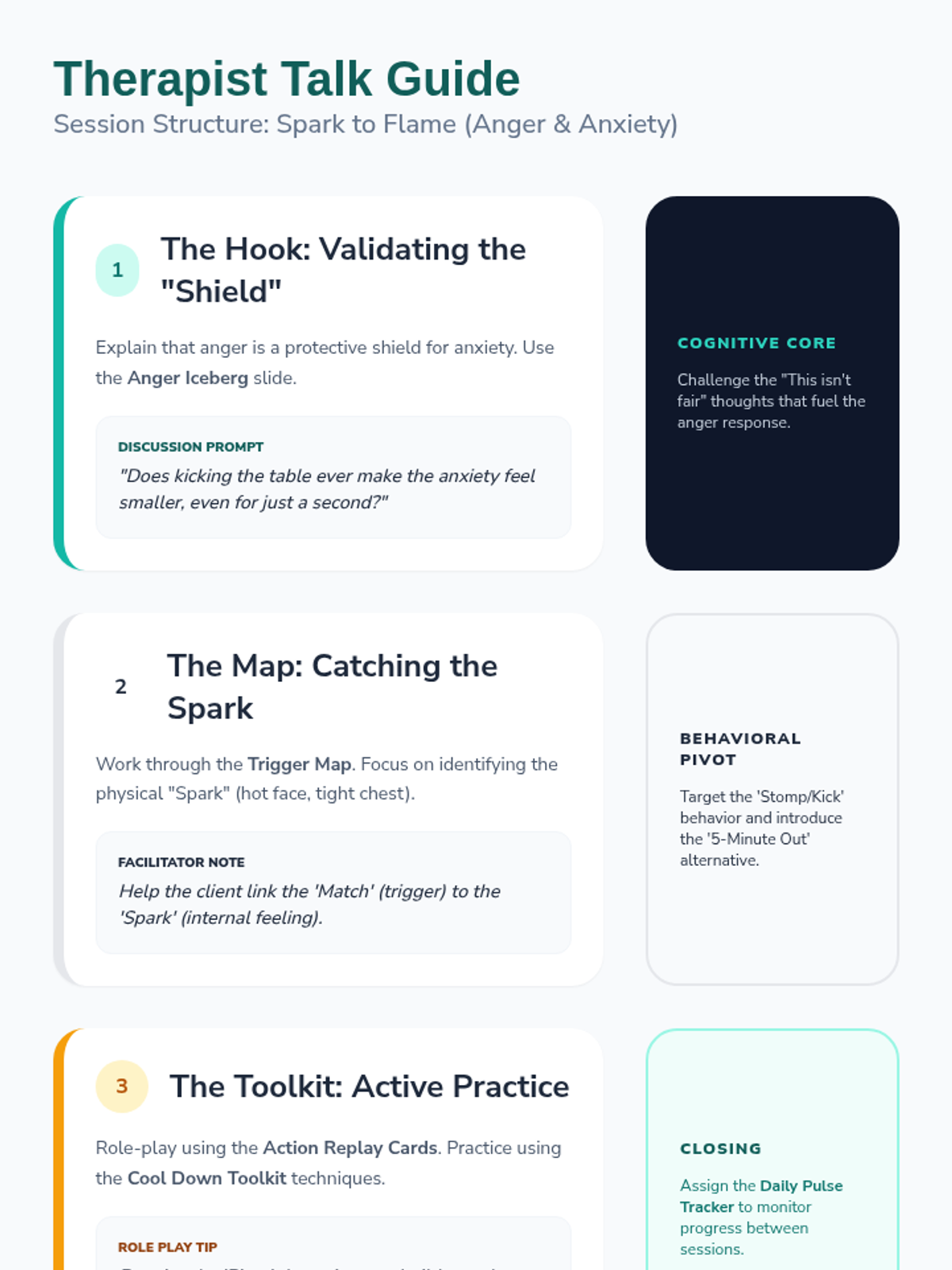 A teacher-facing facilitator guide outlining session flow, discussion prompts, and instructional strategies for the "Spark to Flame" anger management lesson.