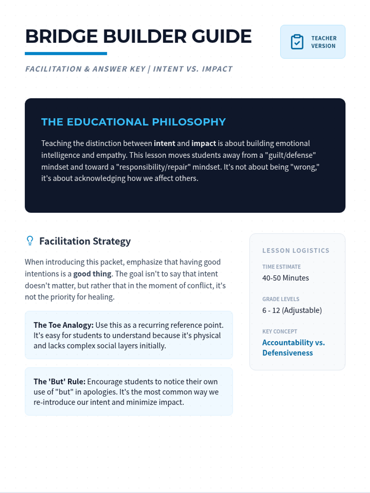 A teacher's facilitation guide and answer key for the Impact Bridge Packet. It includes evaluation criteria for scenarios and guidance on teaching accountability versus defensiveness.