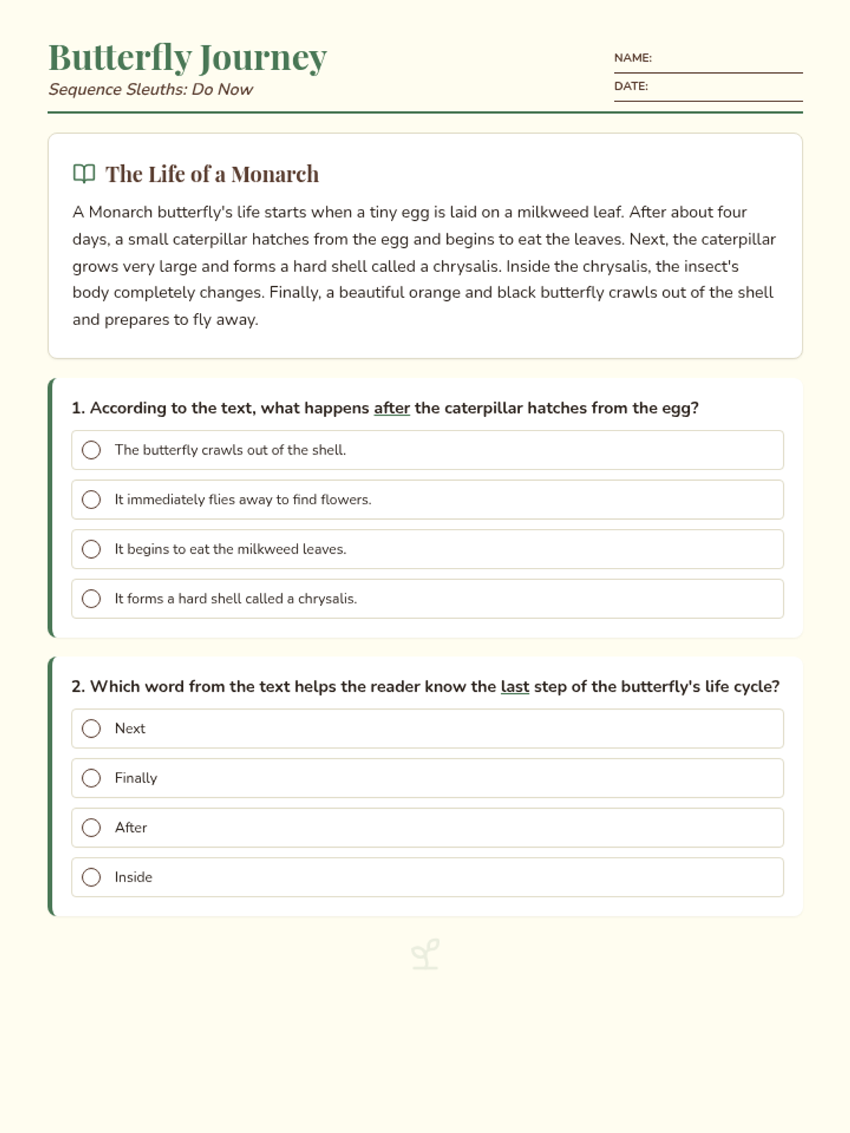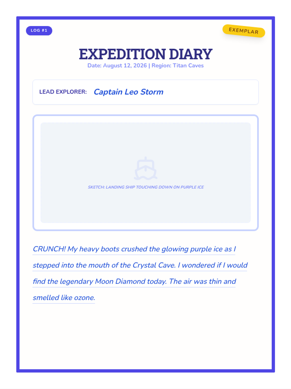 A teacher's exemplar for the 3rd-grade Expedition Diary project. It models high-quality sketches and narrative entries for each of the 5 days. Updated for consistent borders, reduced whitespace, and improved underline styling. Differentiated font weight for better legibility.