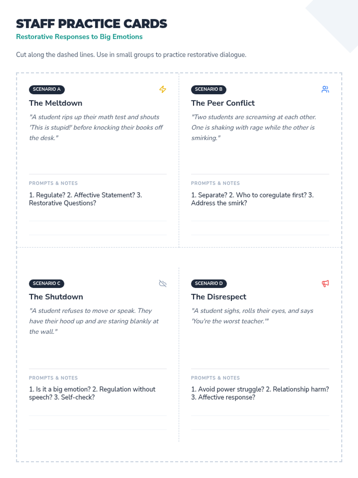 A set of four classroom scenarios for staff to practice applying restorative language and de-escalation strategies.