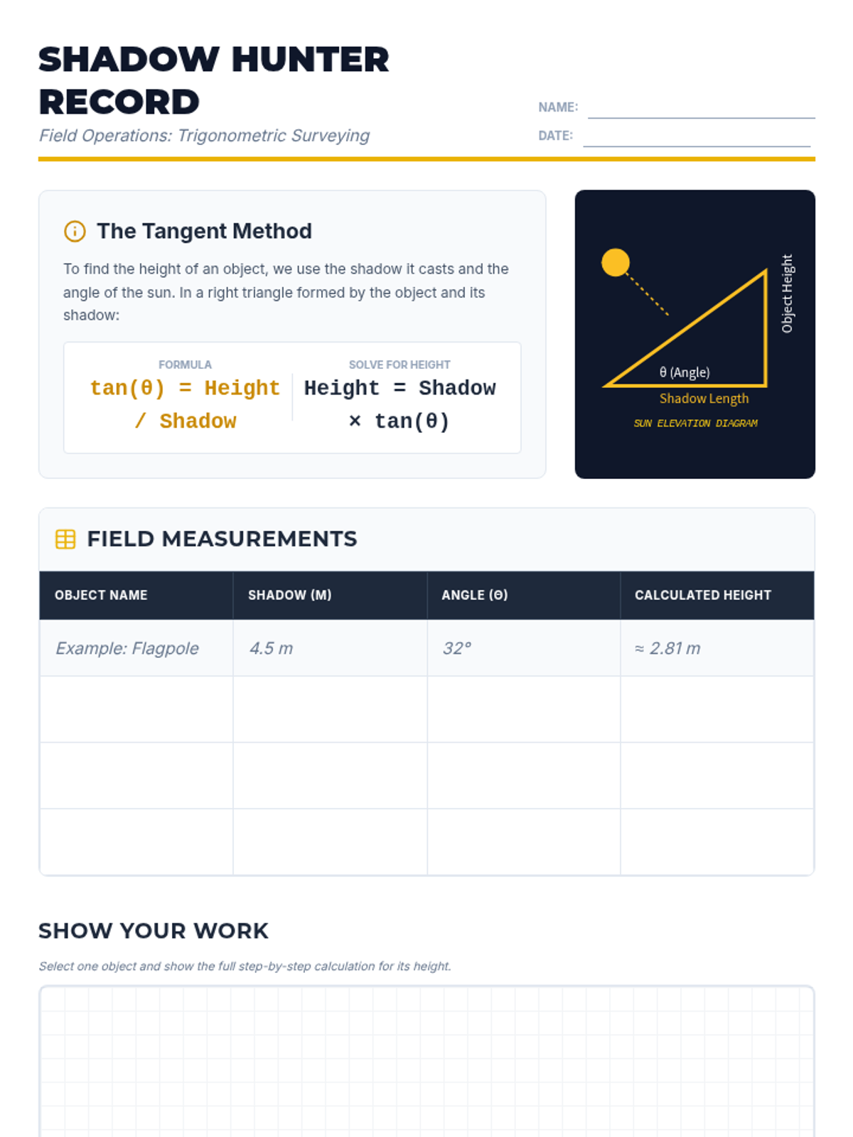 A field data collection sheet for students to record shadow lengths and calculate object heights using the tangent ratio. Includes space for work and reflection questions.