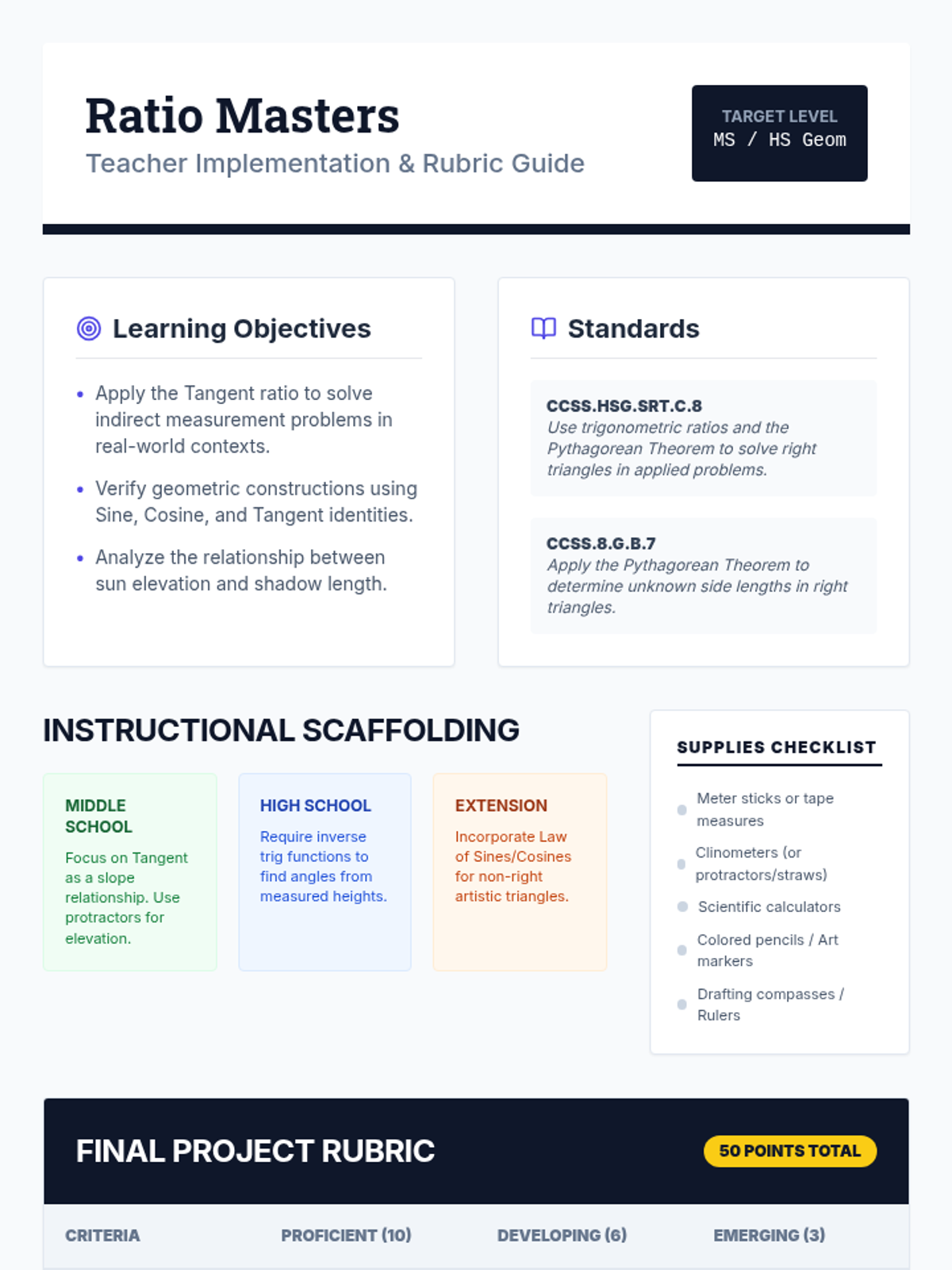 A teacher guide containing learning objectives, standards alignment, differentiation strategies for middle and high school, and a comprehensive grading rubric.