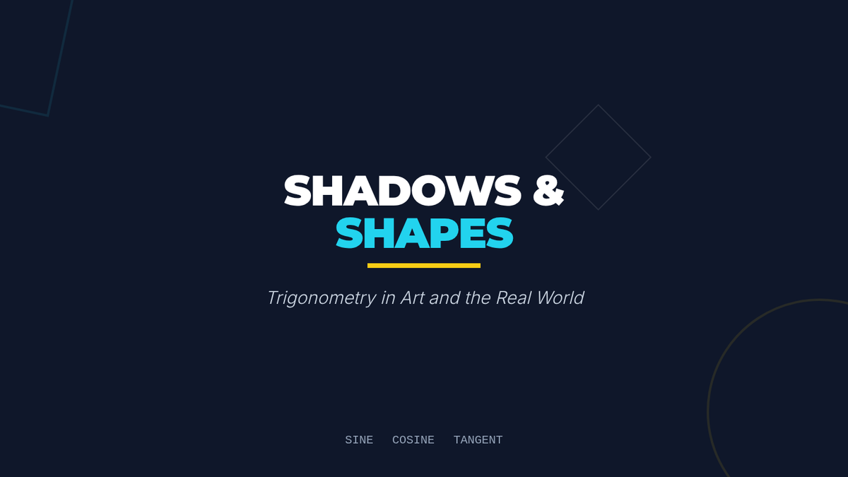 An introductory slide deck for the Shadows and Shapes project, covering trigonometric ratios, the two main project components (Shadow Hunters and Trig Tapestry), and the project timeline.