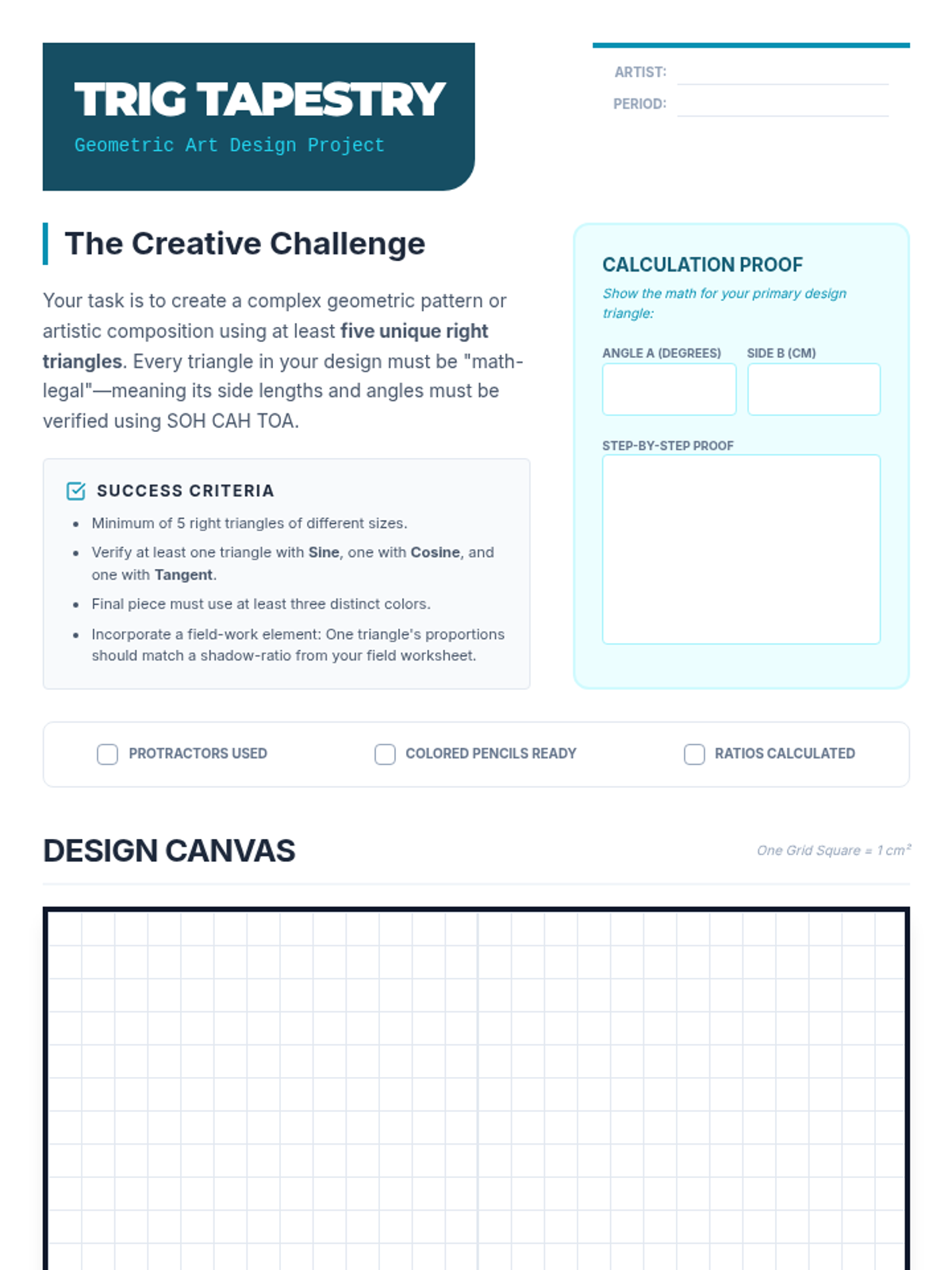 A project guide for the geometric art portion of the lesson. Students design a pattern using right triangles and prove their proportions using trigonometric ratios.