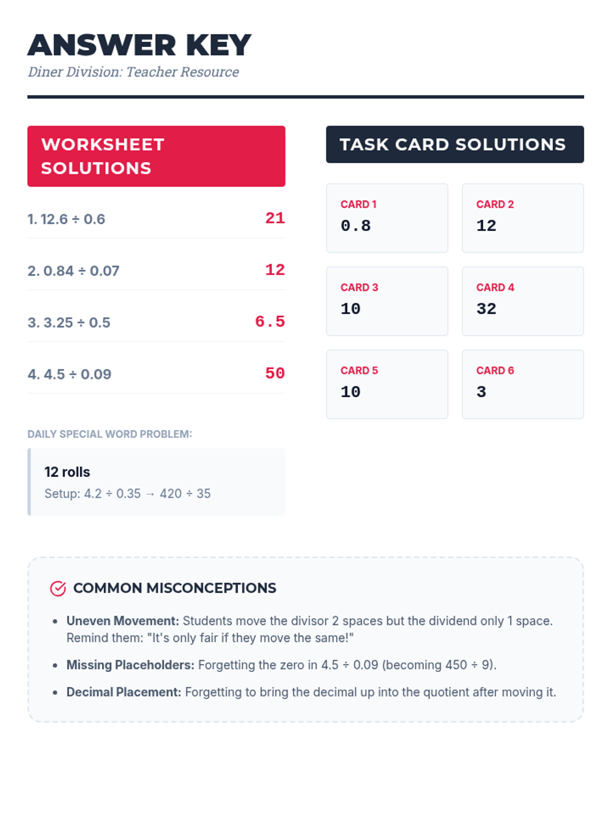 A comprehensive teacher answer key for the Diner Division worksheet and task cards. Includes step-by-step notes for the word problems and a guide to identifying common student misconceptions.