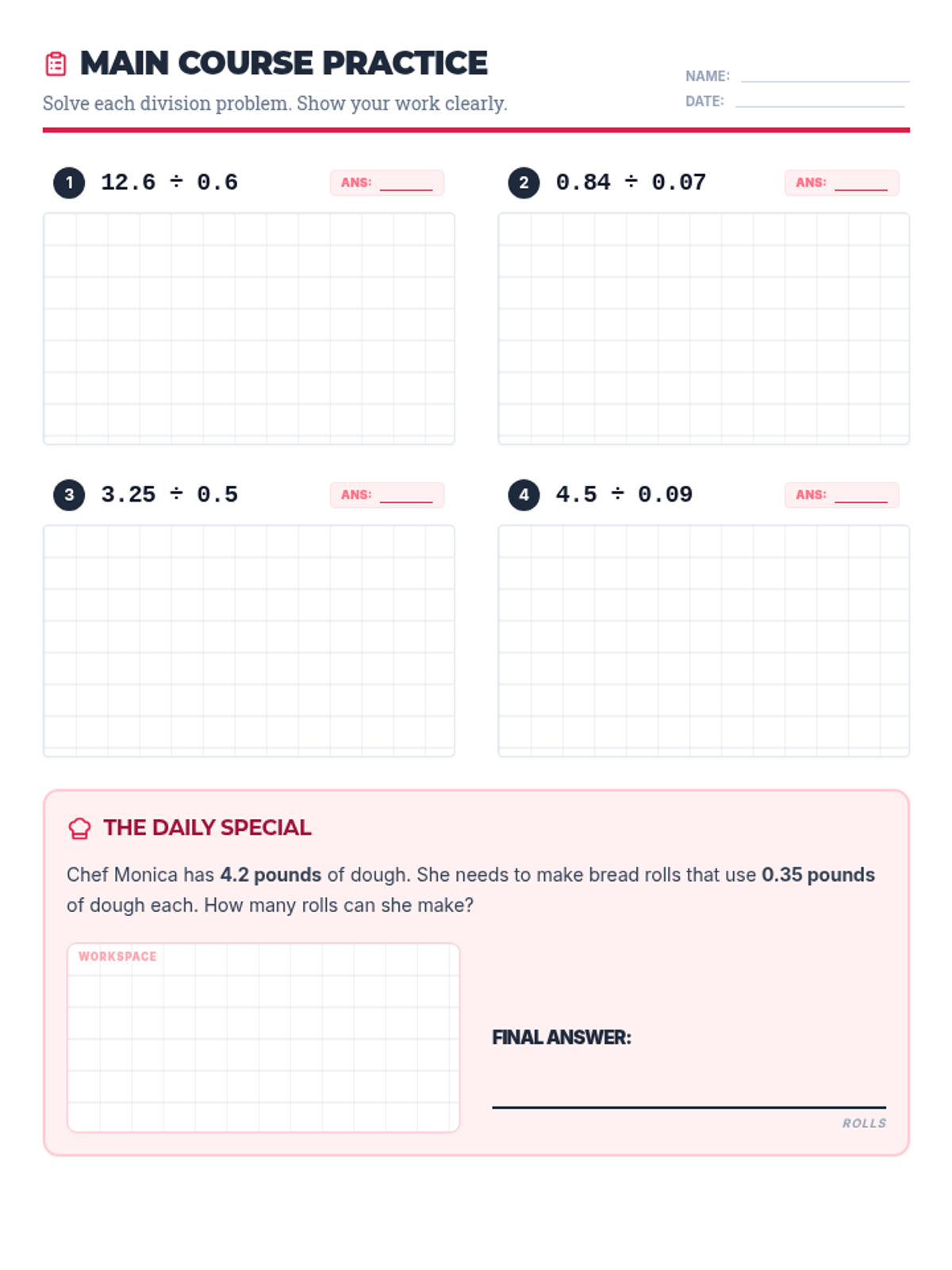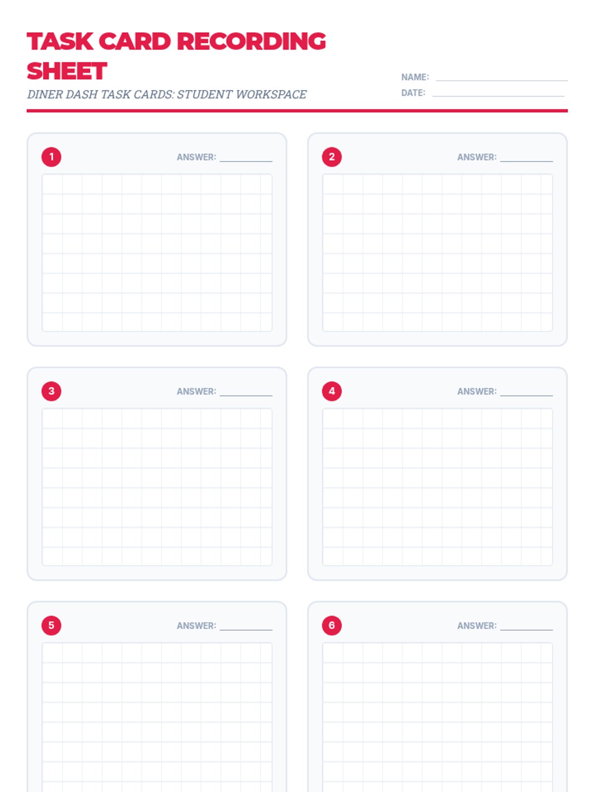 A recording sheet for students to use with the Diner Dash Task Cards. Provides numbered workspace boxes with alignment grids to help students show their work and record final answers.