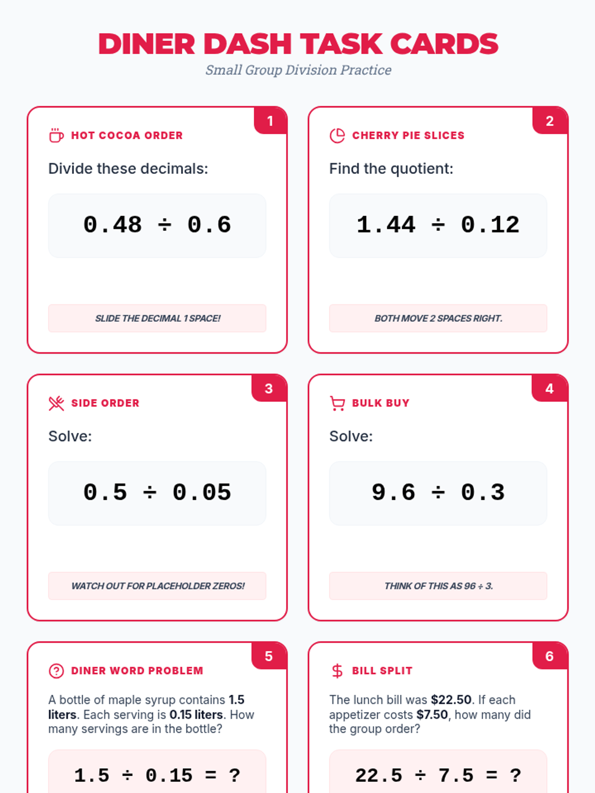 A set of 6 themed task cards for small group practice. Includes a mix of computational problems and real-world diner-themed word problems to build fluency in dividing decimals by decimals.