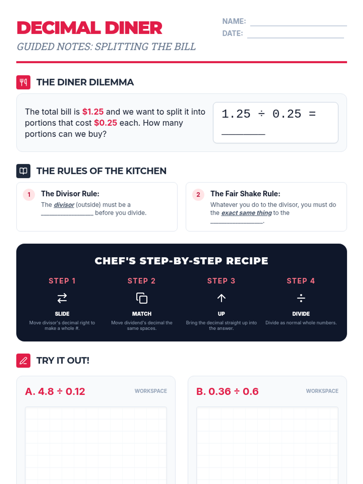 A student guided notes handout to accompany the Diner Division lesson. Includes fill-in-the-blank rules, a visual 4-step reference, and dedicated workspace for practice problems.