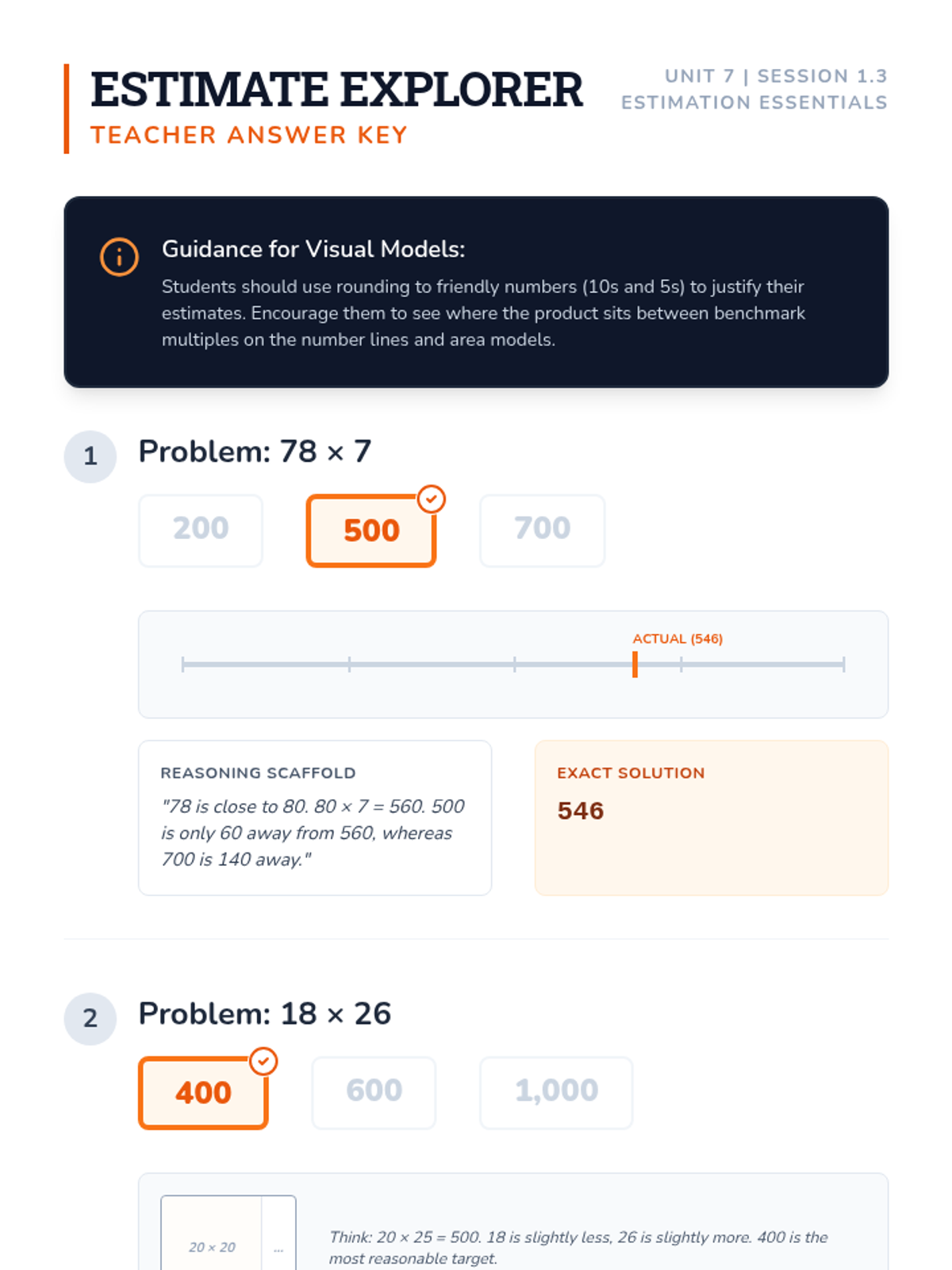 An answer key for the Estimate Explorer worksheet providing correct estimates, sample reasoning based on visual models, exact solutions, and teacher instructional tips.