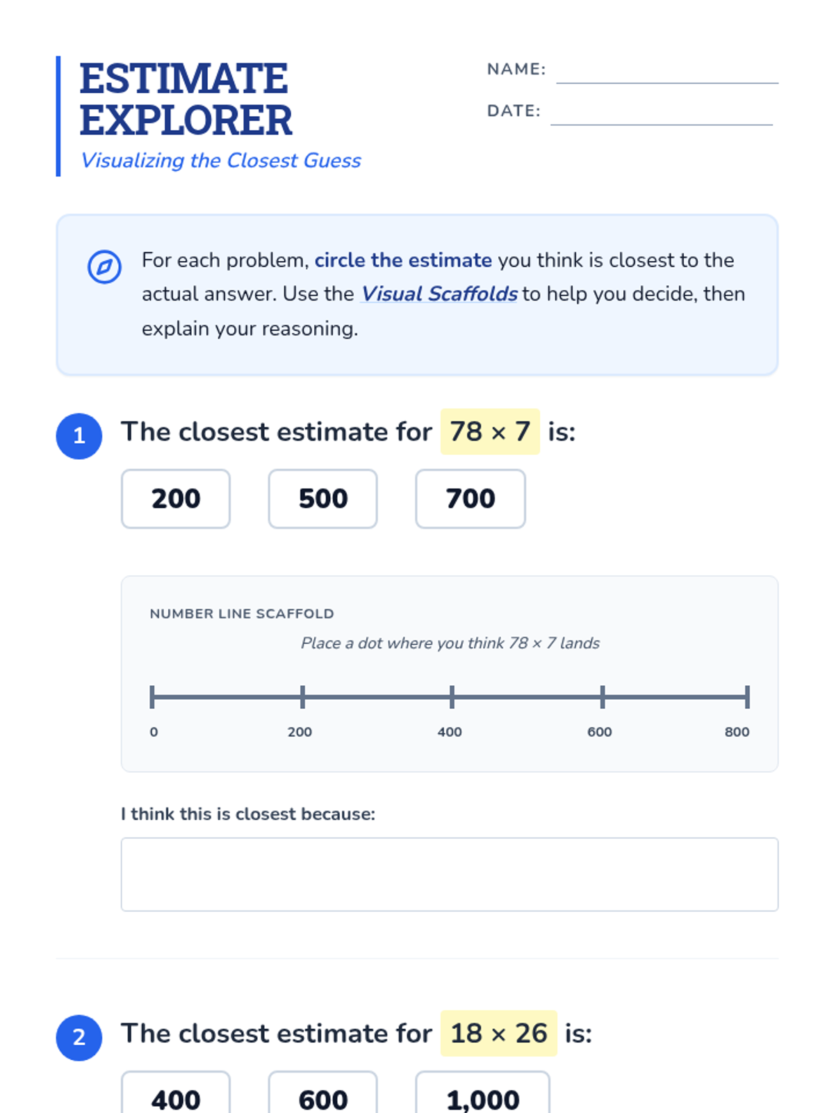 A modified version of the Closest Estimate worksheet featuring number lines, area model sketches, and benchmark calculation scaffolds to support student reasoning.