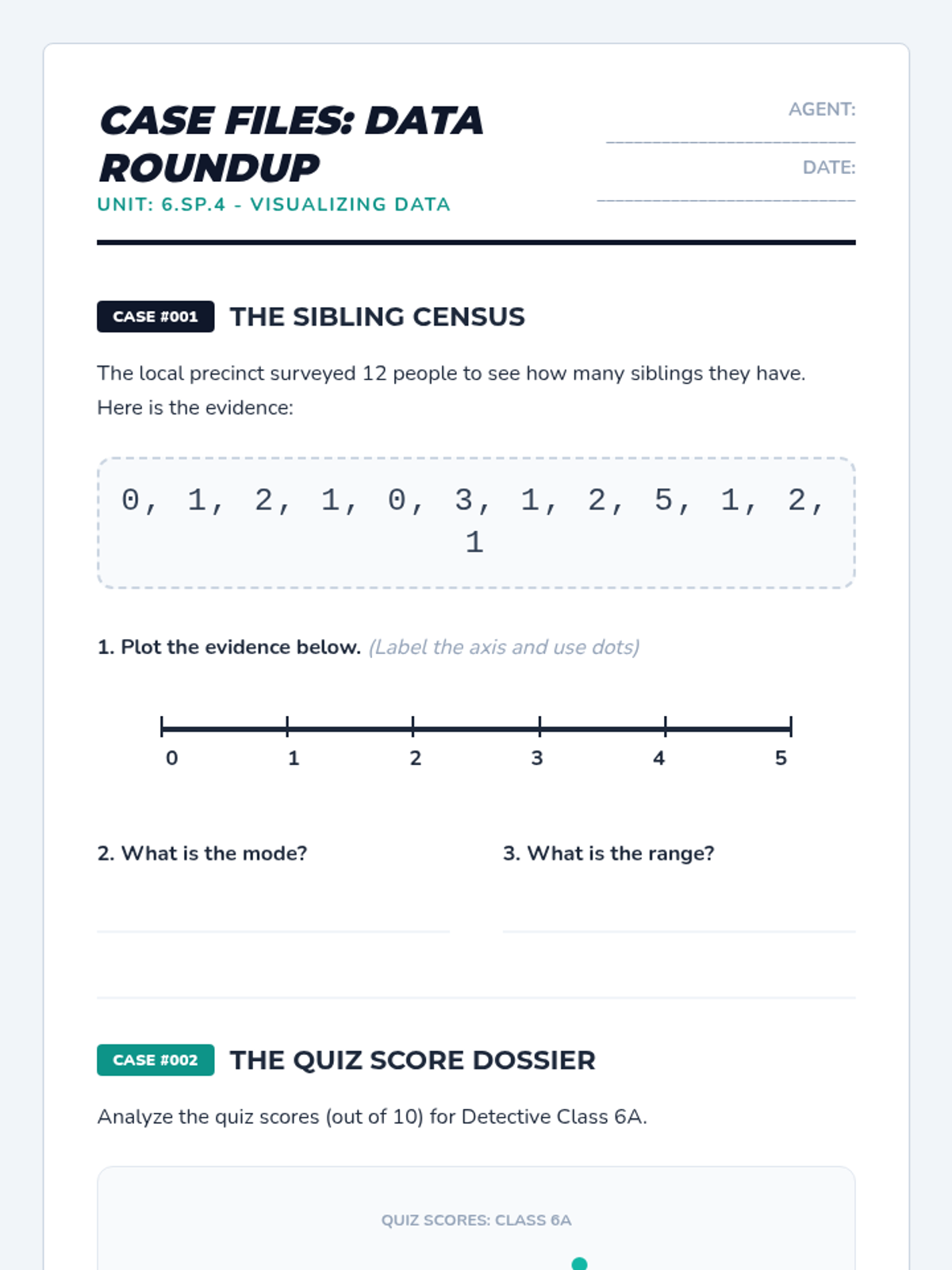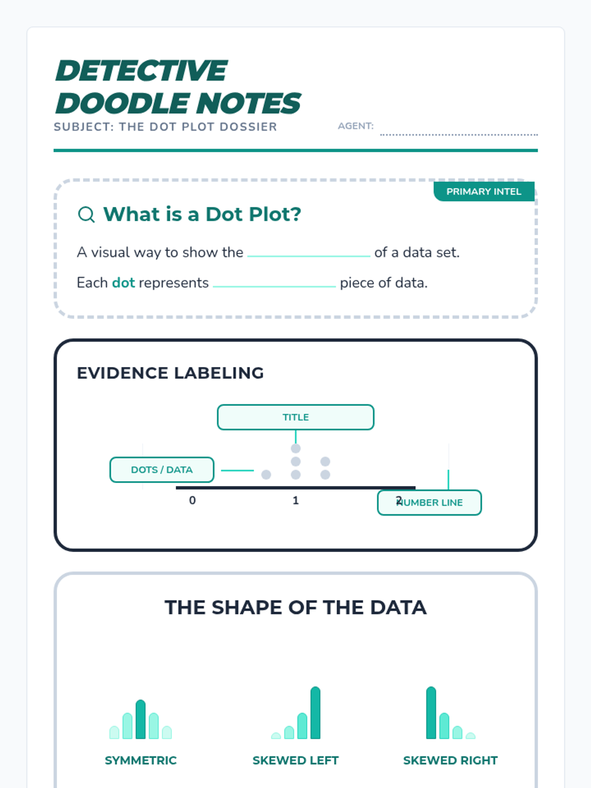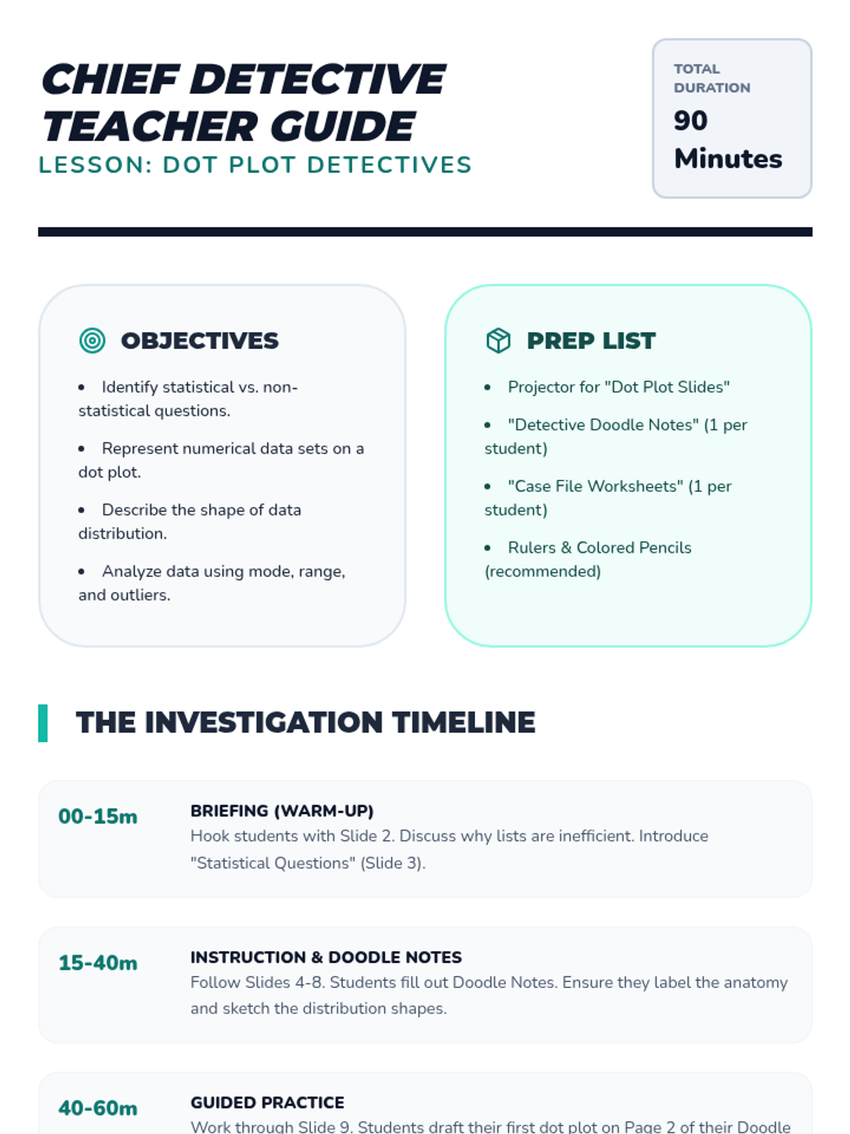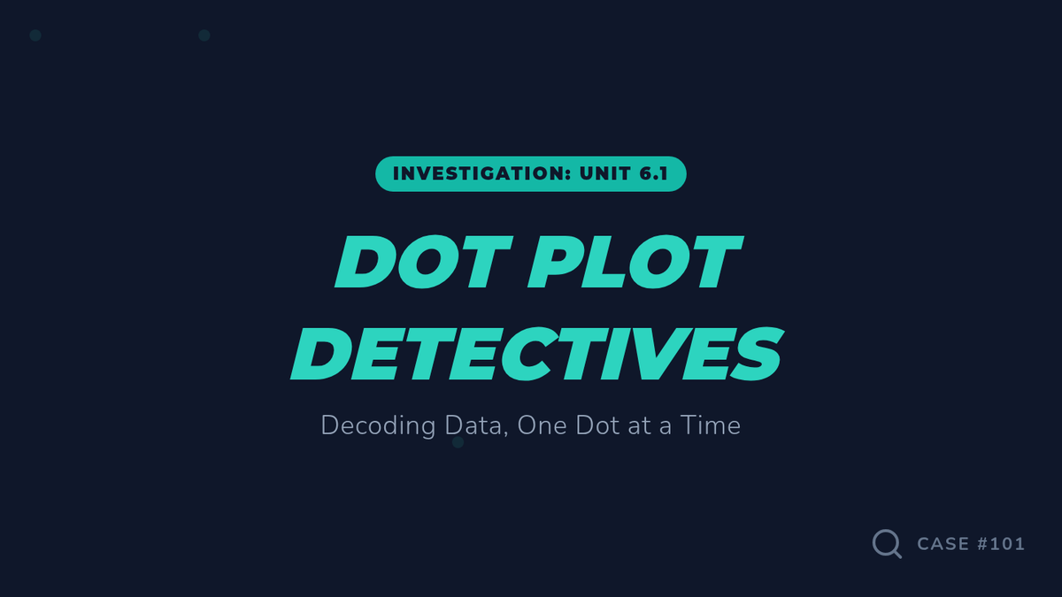 An engaging, visual slide deck for teaching 6th graders how to create and analyze dot plots, featuring detective-themed graphics and vocabulary guides.