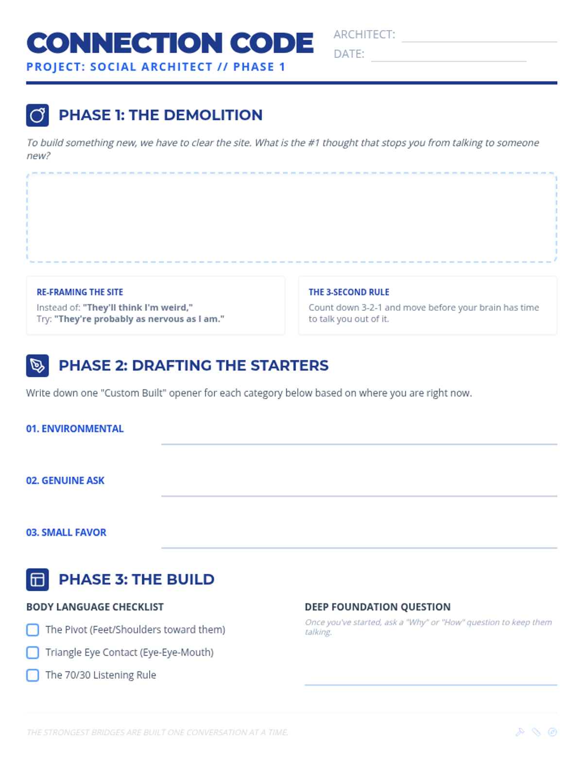 A structured worksheet that helps students identify social barriers and draft their own conversation starters based on the architectural 'blueprint' framework.
