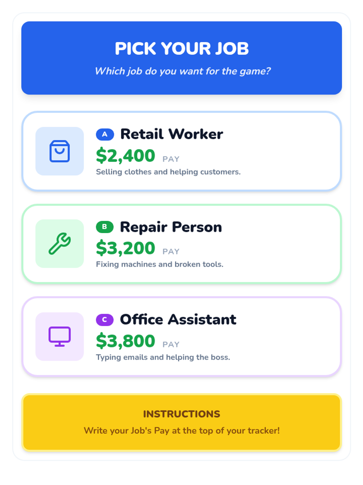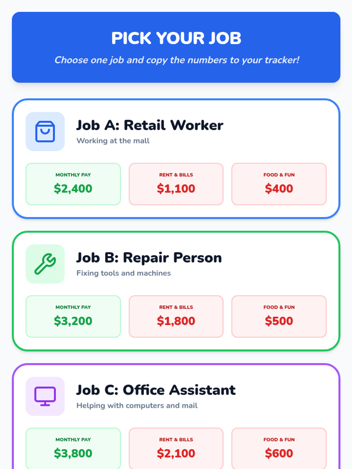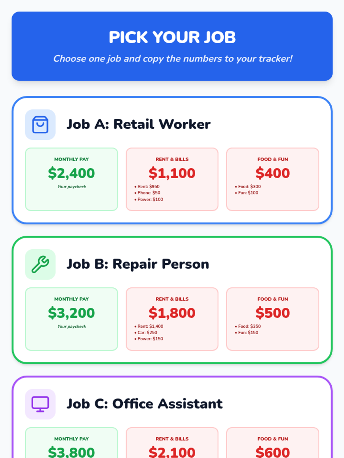 A reference sheet for the budgeting simulation featuring three career options (Retail, Repair, Office) with clear monthly pay amounts and icons, designed for easy comparison and selection by students.