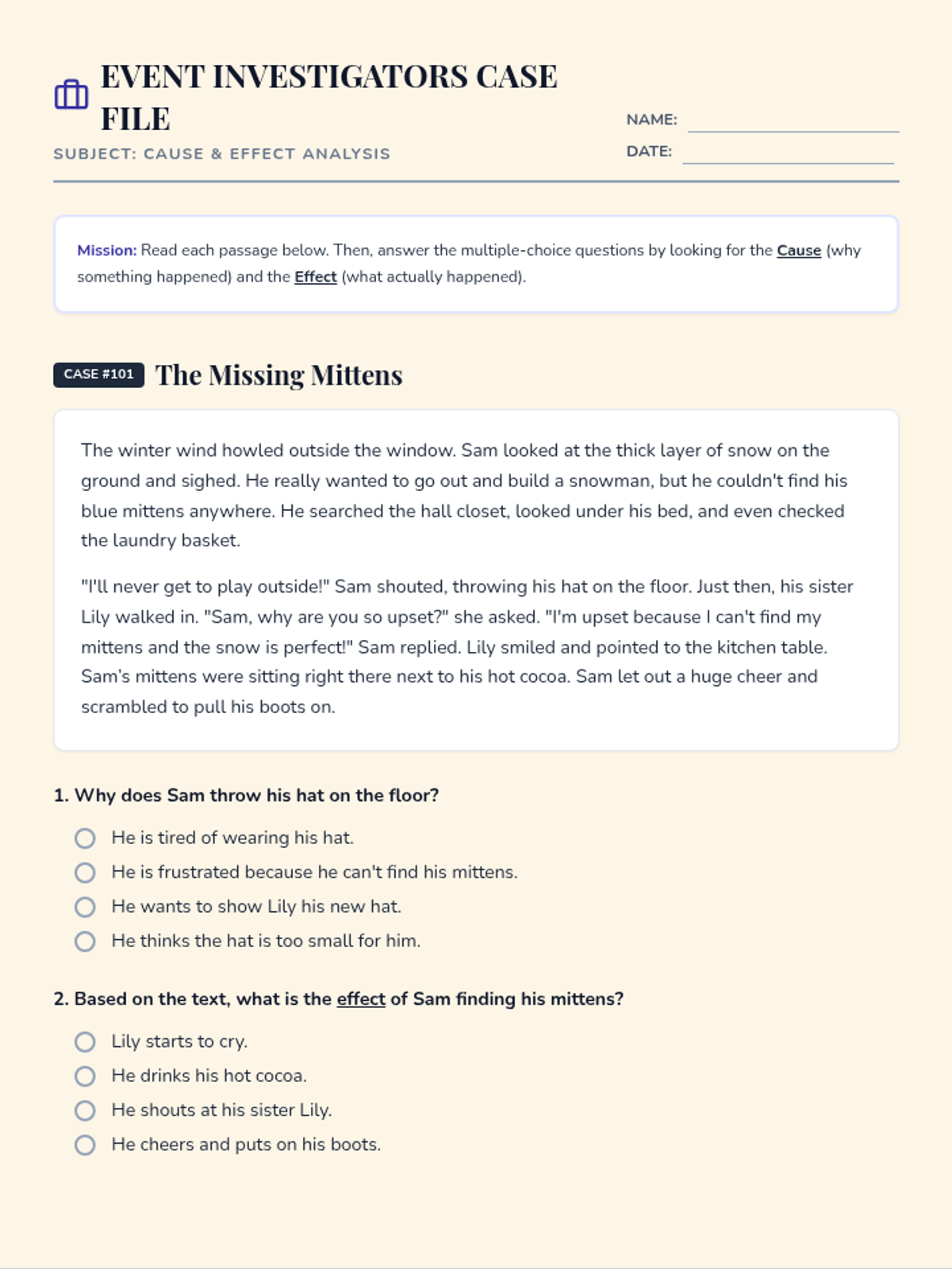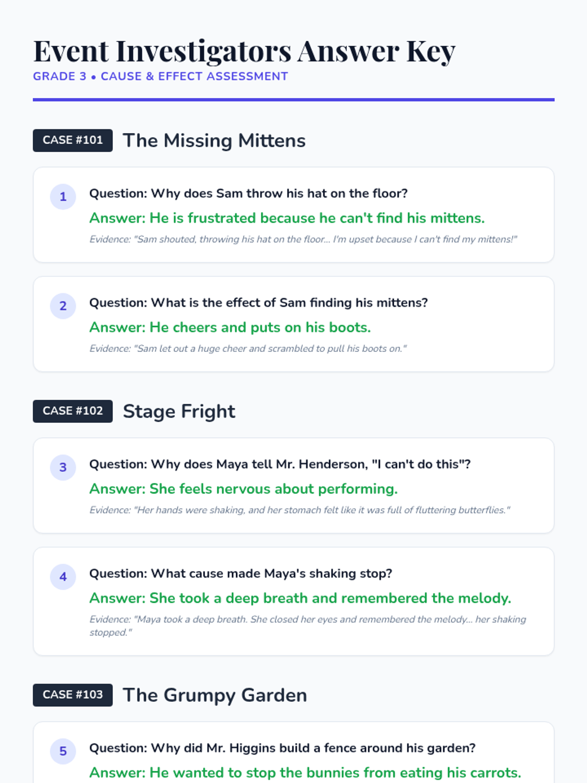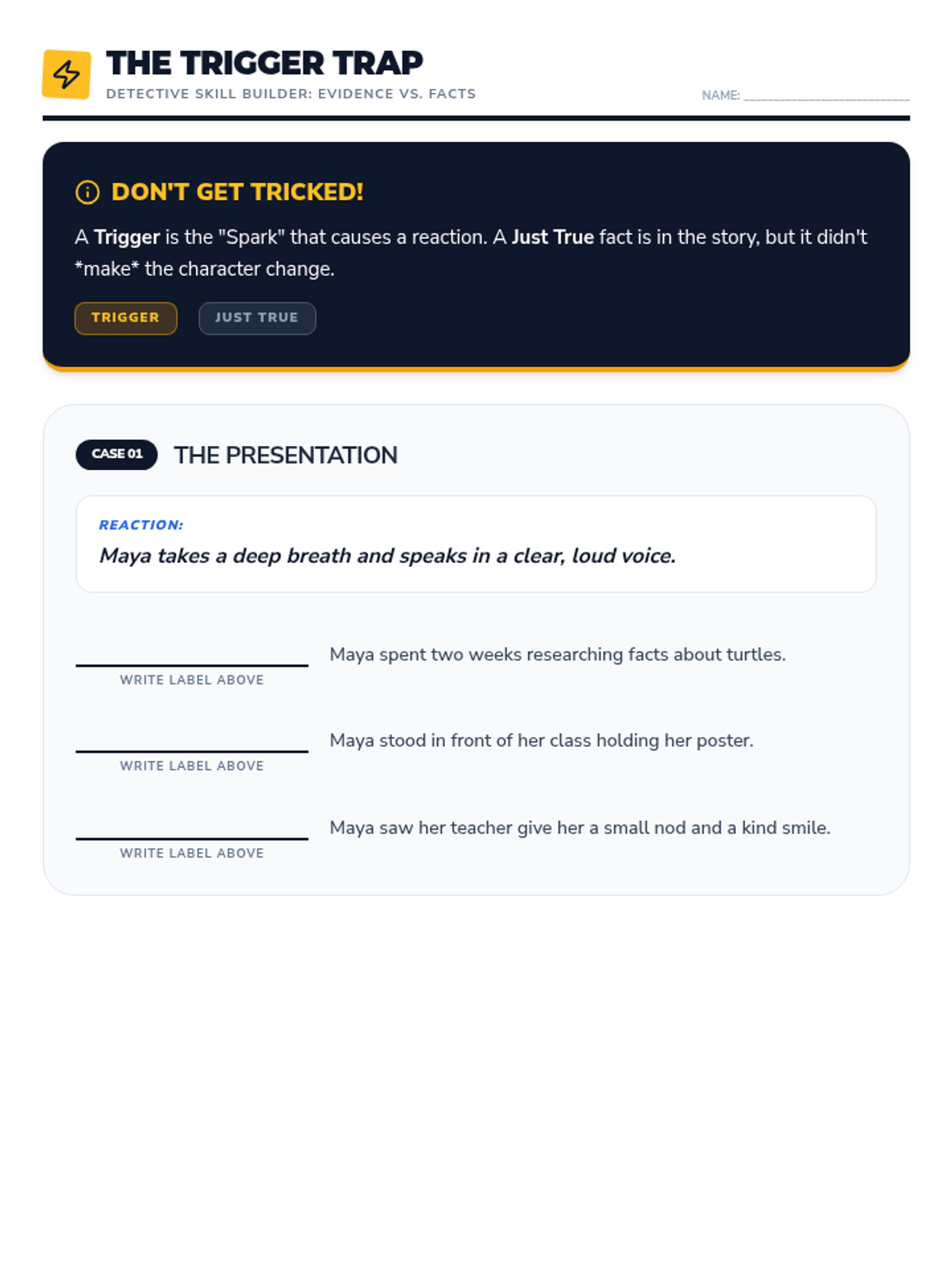 A targeted skill-building activity for 3rd graders to practice distinguishing between immediate triggers (causes) and background facts in a story. Designed to address common misconceptions in text evidence identification. Now with improved layout and readability.
