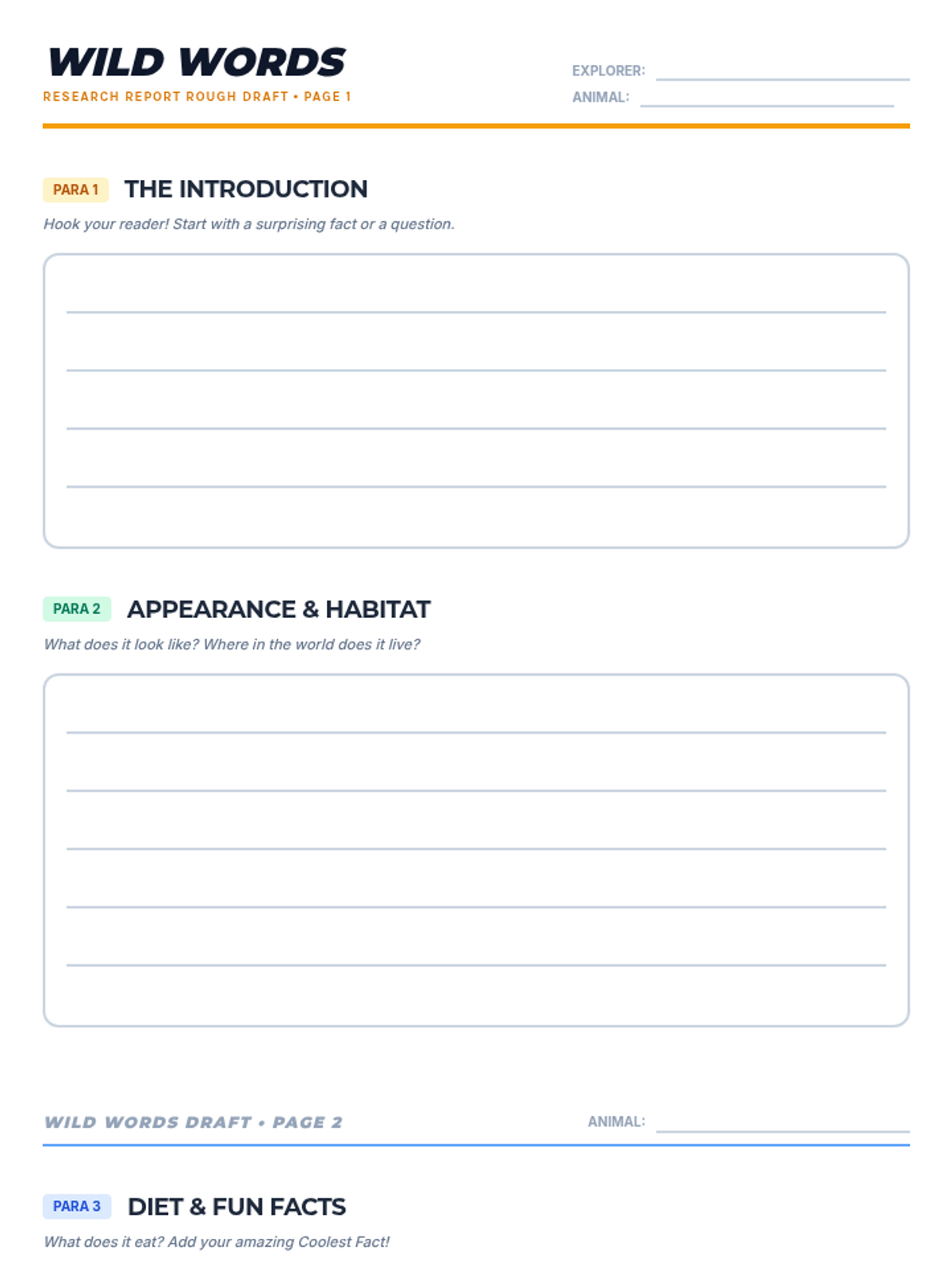 A guided rough draft template for 3rd graders that breaks down an animal research report into manageable paragraphs with helpful prompts and a final self-checklist.
