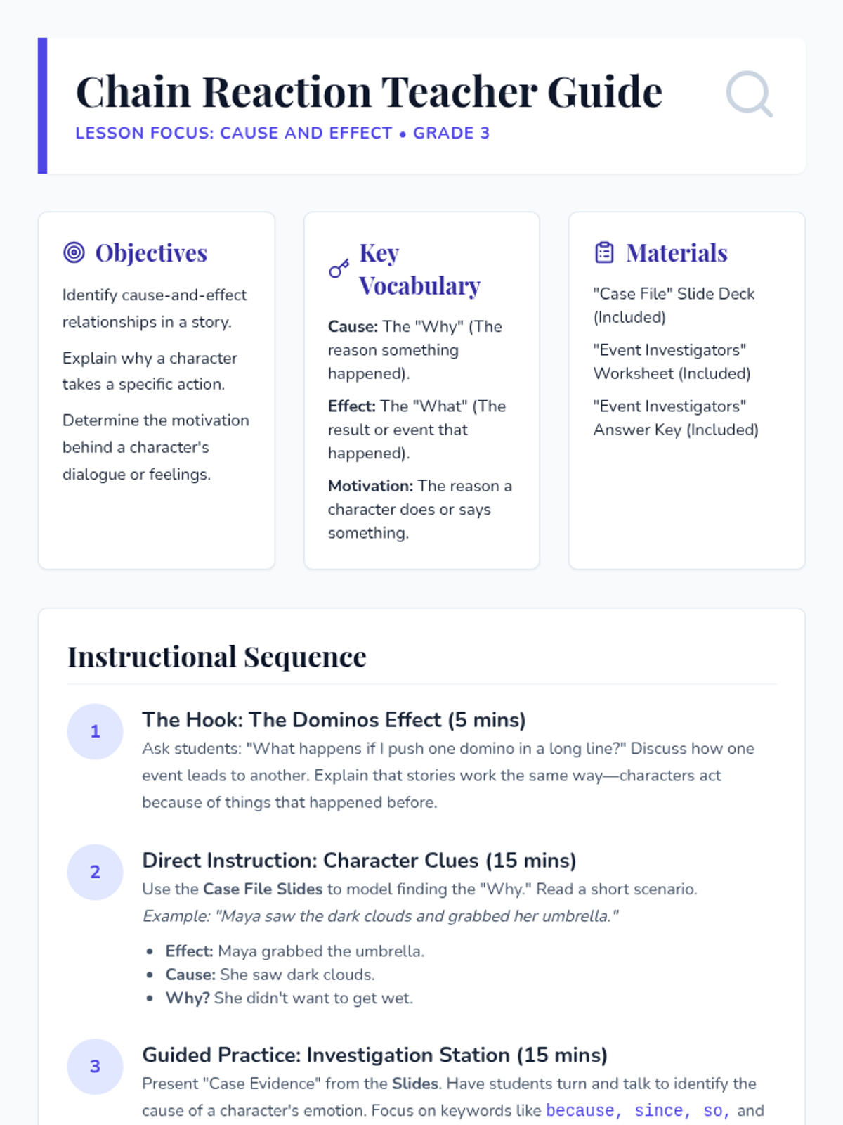 A detailed teacher's guide for a 3rd-grade cause and effect lesson, featuring an instructional sequence, learning objectives, and tips for differentiation.