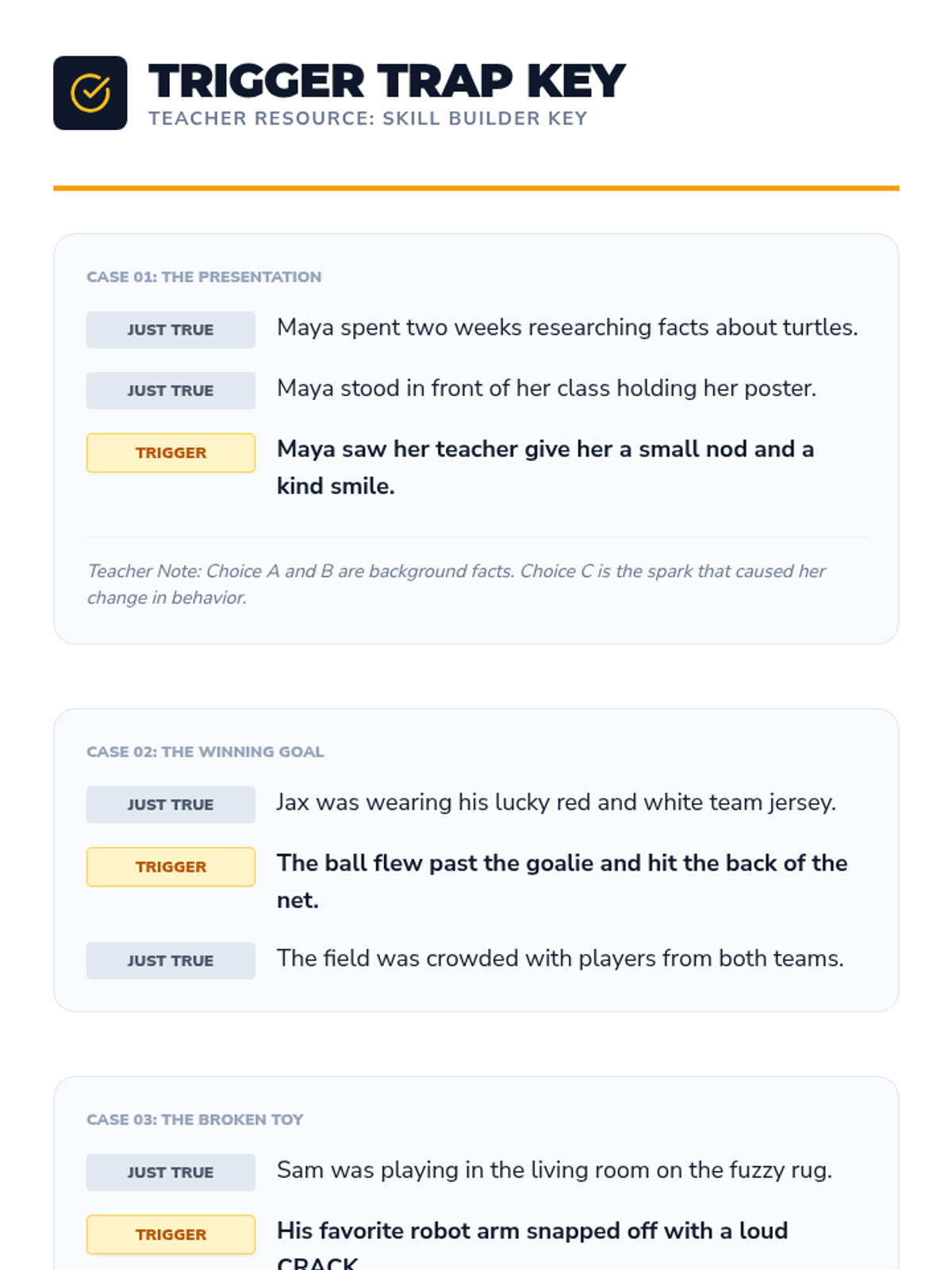 The answer key for the Trigger Trap Activity, providing labels and pedagogical tips for distinguishing between triggers and background facts. Now with improved page break handling and alignment.