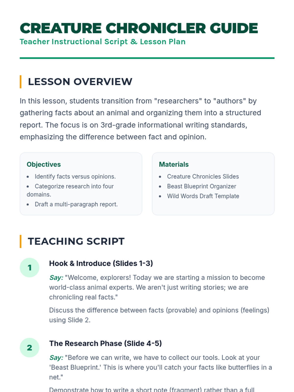 A comprehensive teacher guide for the Creature Chroniclers lesson, featuring an instructional script, differentiation strategies, and clear learning objectives for animal research writing.
