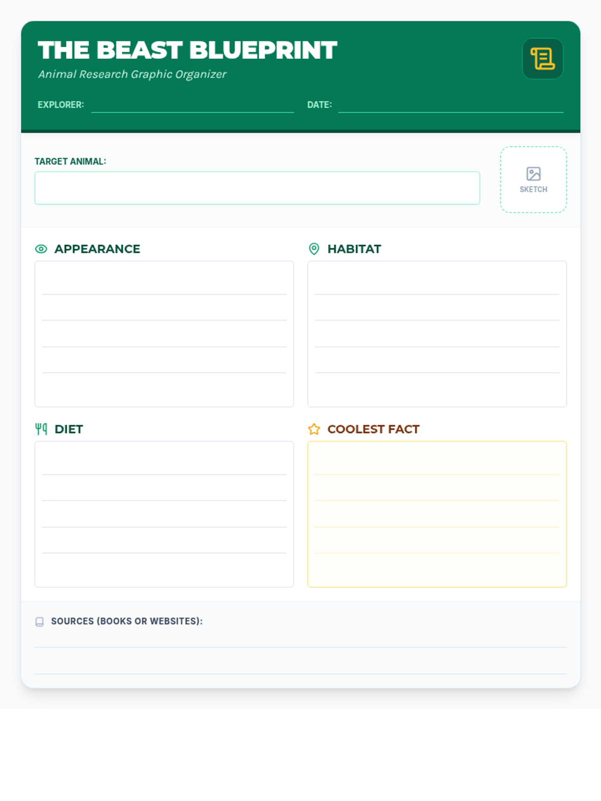A structured graphic organizer for 3rd-grade students to record facts about an animal's appearance, habitat, diet, and unique characteristics during their research phase.