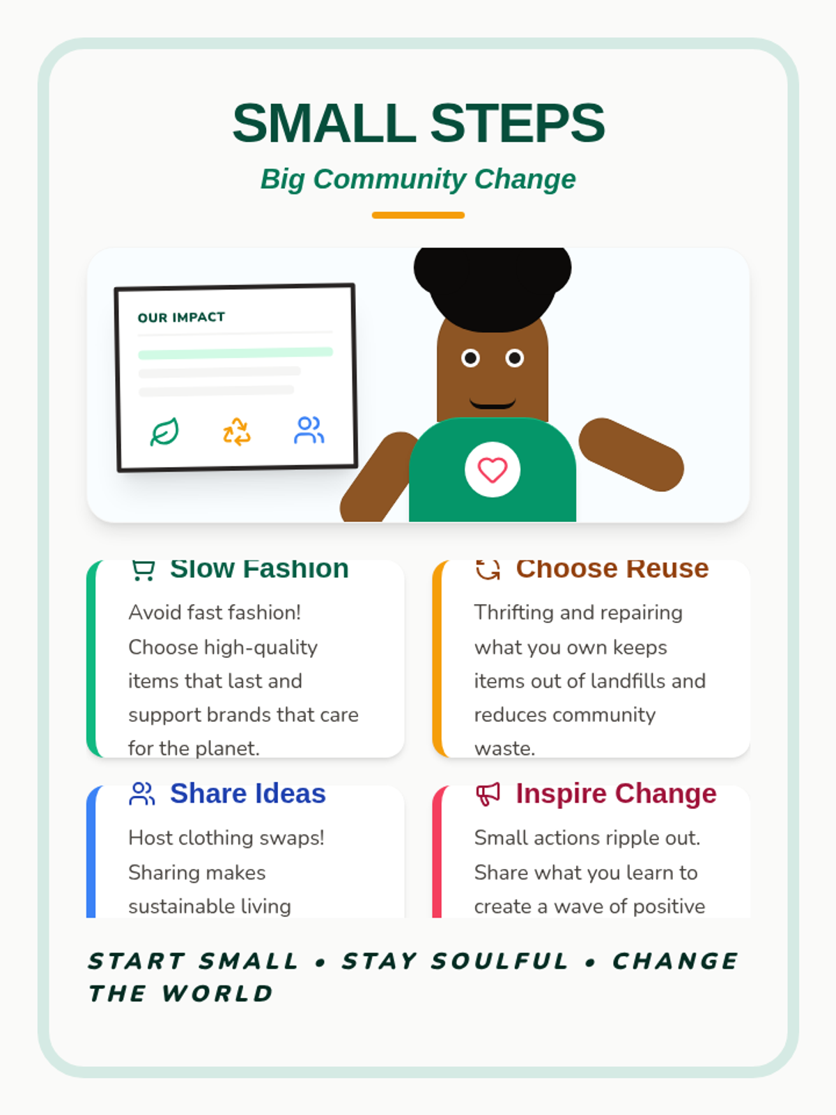 A classroom poster featuring a stylized graphic of a BIPOC student presenting on sustainable fashion and community impact. The poster includes educational tips on avoiding over-consumerism and the benefits of reusing items.