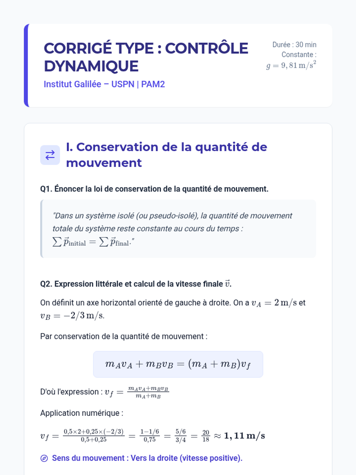 Un corrigé type complet et rédigé pour le contrôle de dynamique (PAM2). Le document inclut les solutions détaillées pour la conservation de la quantité de mouvement, la machine d'Atwood et les oscillations d'un système masse-ressort, avec calculs et schémas améliorés pour la lisibilité et les sauts de page.