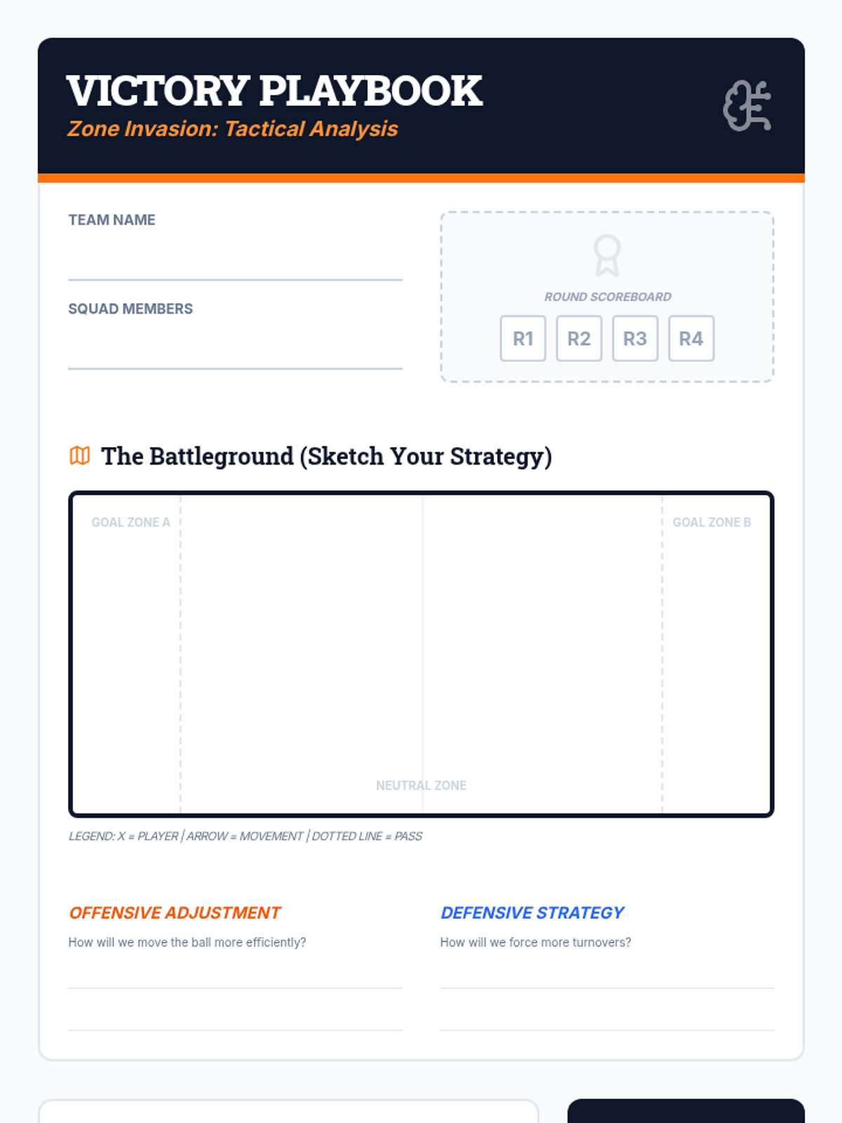 A tactical strategy sheet for students to use during team huddles. Includes a field diagram for sketching plays and sections for offensive and defensive reflections.