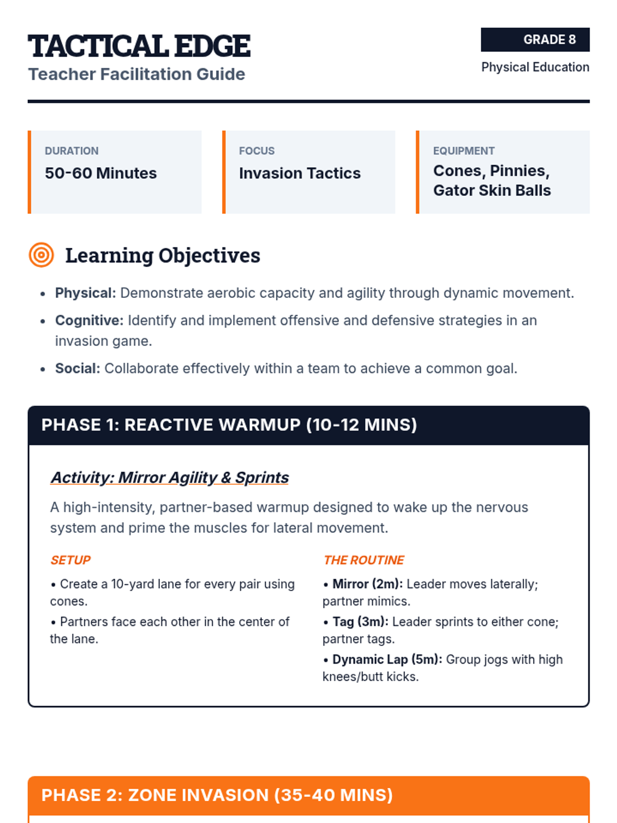 A comprehensive PE lesson plan for Grade 8, focusing on invasion game tactics. Includes a reactive mirror warmup, detailed game rules for 'Zone Invasion', and tactical coaching prompts.