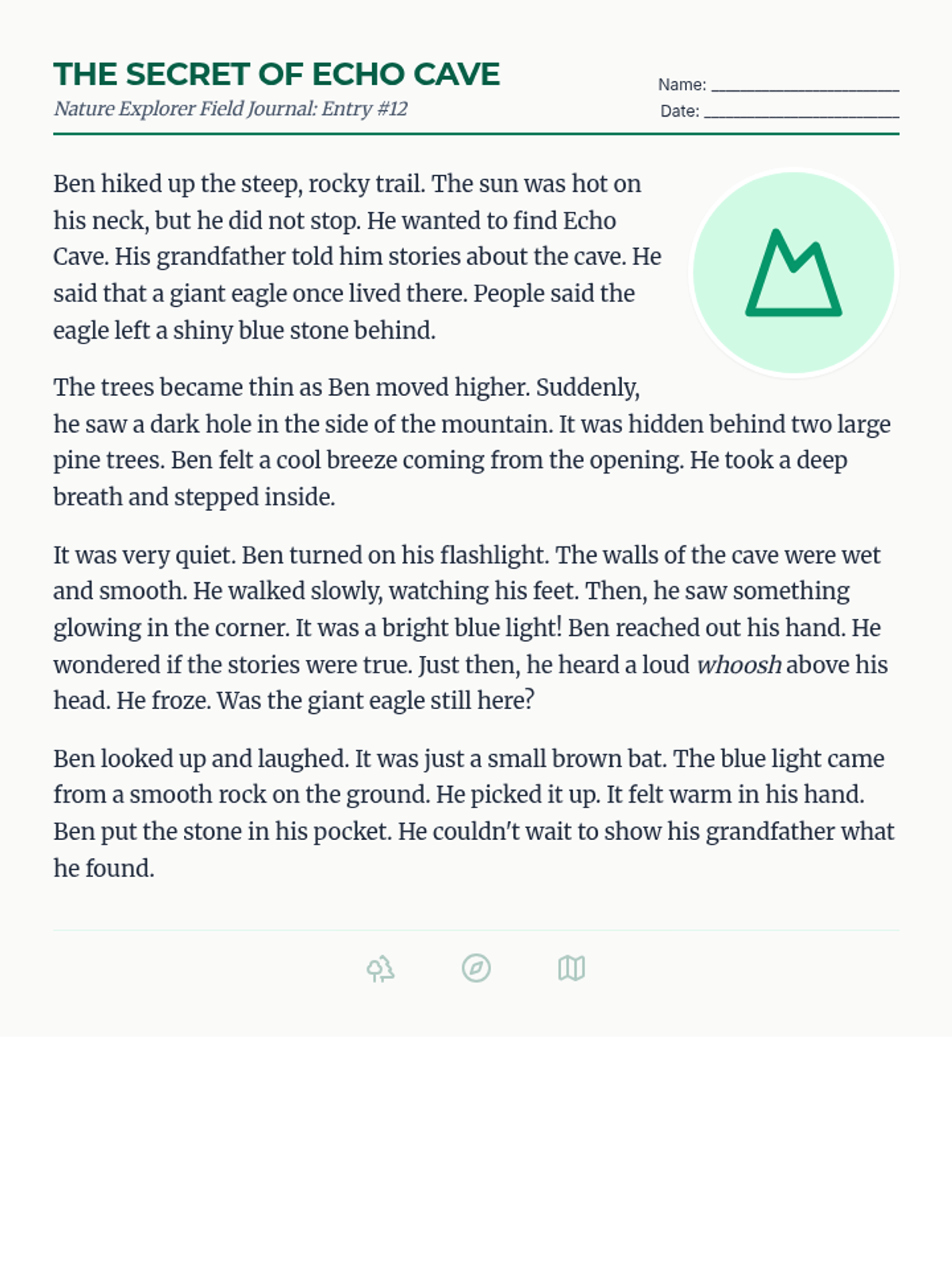 An engaging 3rd-grade level reading passage about a boy discovering a mysterious cave, designed for a 5th-grade student to practice reading fluency and comprehension.