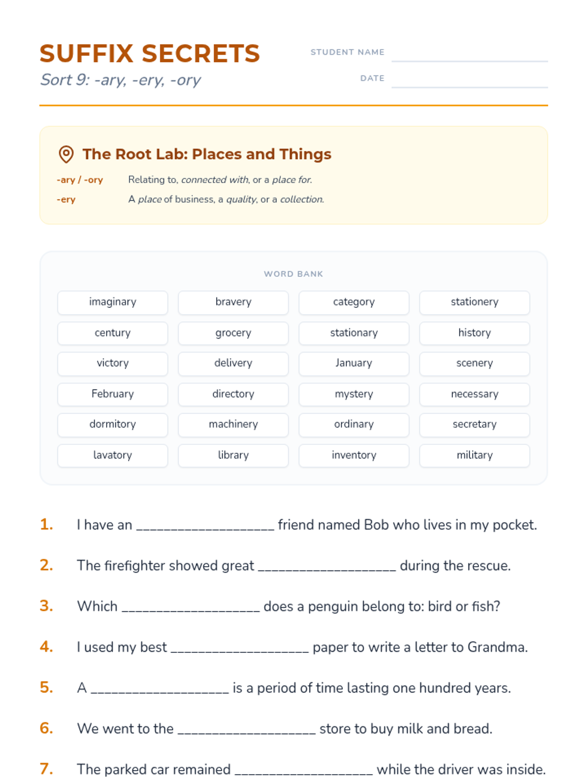 Worksheets for Sorts 9 and 10, focusing on location/relational suffixes (-ary, -ery, -ory) and state suffixes (-ty, -ity). Features clear root definitions and 4th-grade level sentences.